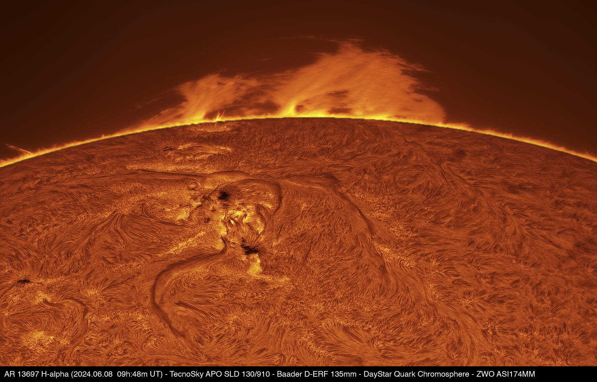 The active region 13697 imaged in the H-alpha-line on 8 June 2024 from Syracuse, Italy. Note a noticeable prominence.