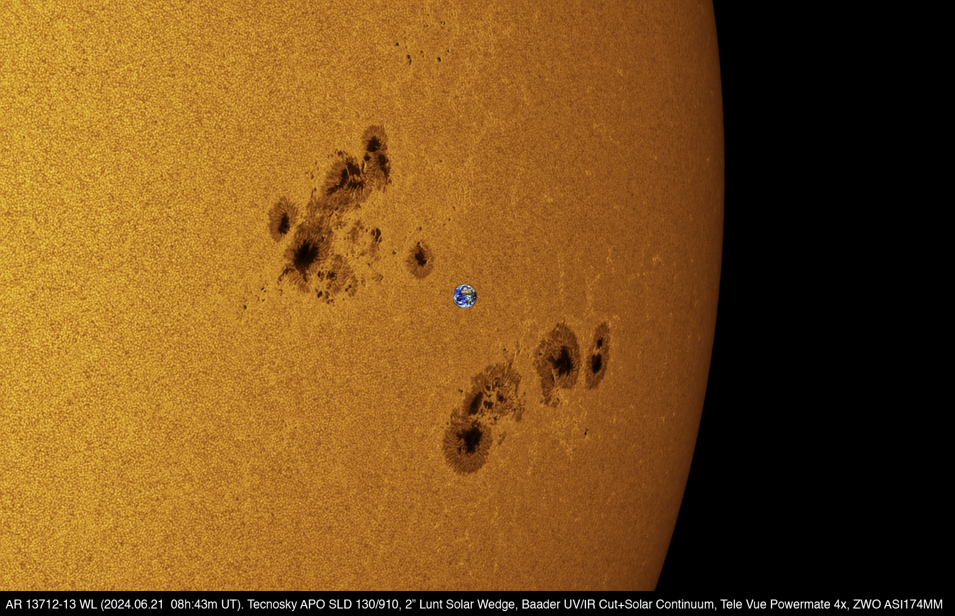 The active regions 13712 and 13713 imaged in white light from Syracuse, Italy, on June 21, 2024 (summer solstice day).