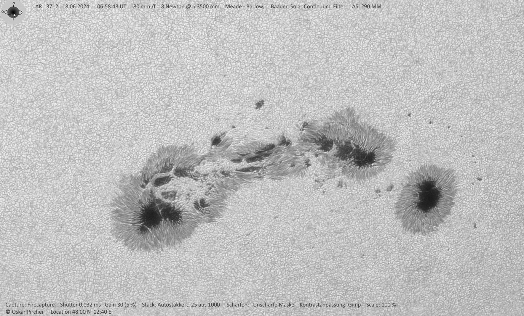 Endlich wirklich gutes Seeing für Sonnenaufnahmen. Daher konnte ich mein bisher bestes Bild in diesem Jahr aufnehmen. Hilfreich war sicher auch der frühe Aufnahmezeitpunkt. Ich habe mit etwa 3500 mm eine längere Aufnahmebrennweite als üblich gewählt. Die aktive Region 13712 zeigt sich im Magnetogramm als bipolare Gruppe, was sich auch durch das scheinbare Ineinanderlaufen der Fibrillen zwischen dem linken und dem mittleren Fleck erkennen lässt.