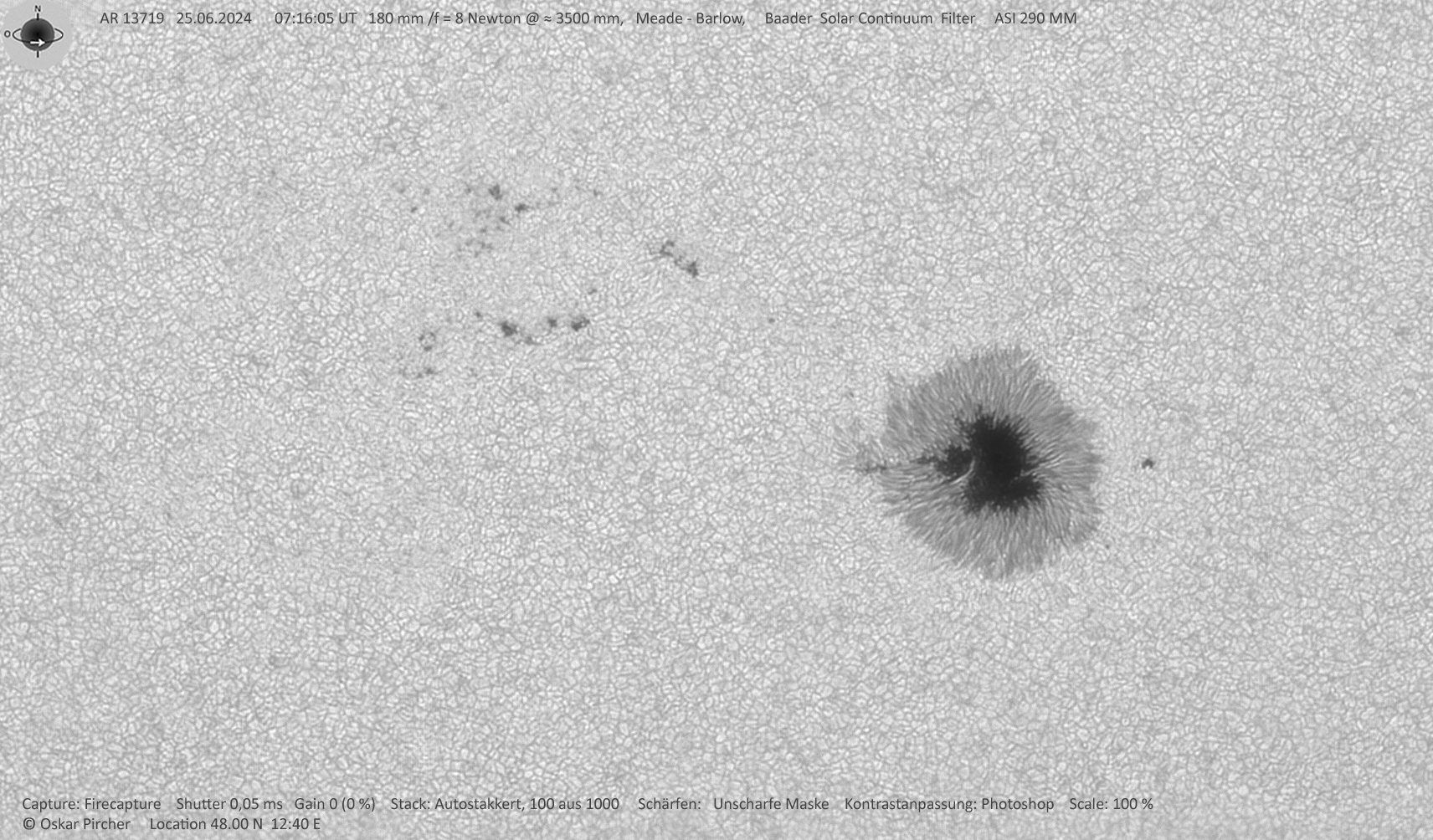 | Teleskop/Objektiv | 180 mm Newton, Baader Solar Continuum Filter |