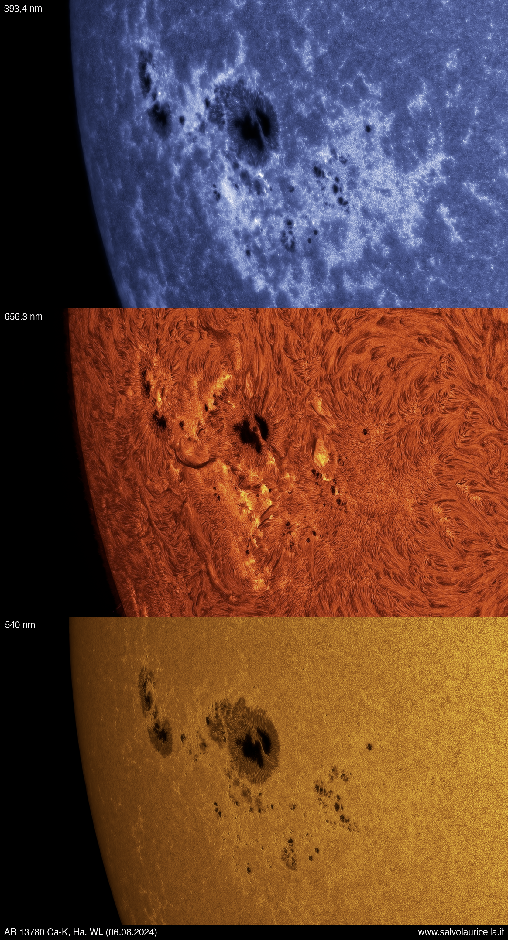 Active region 13780 imaged on August 6, 2024 in Ca-K, H-alpha and white light
