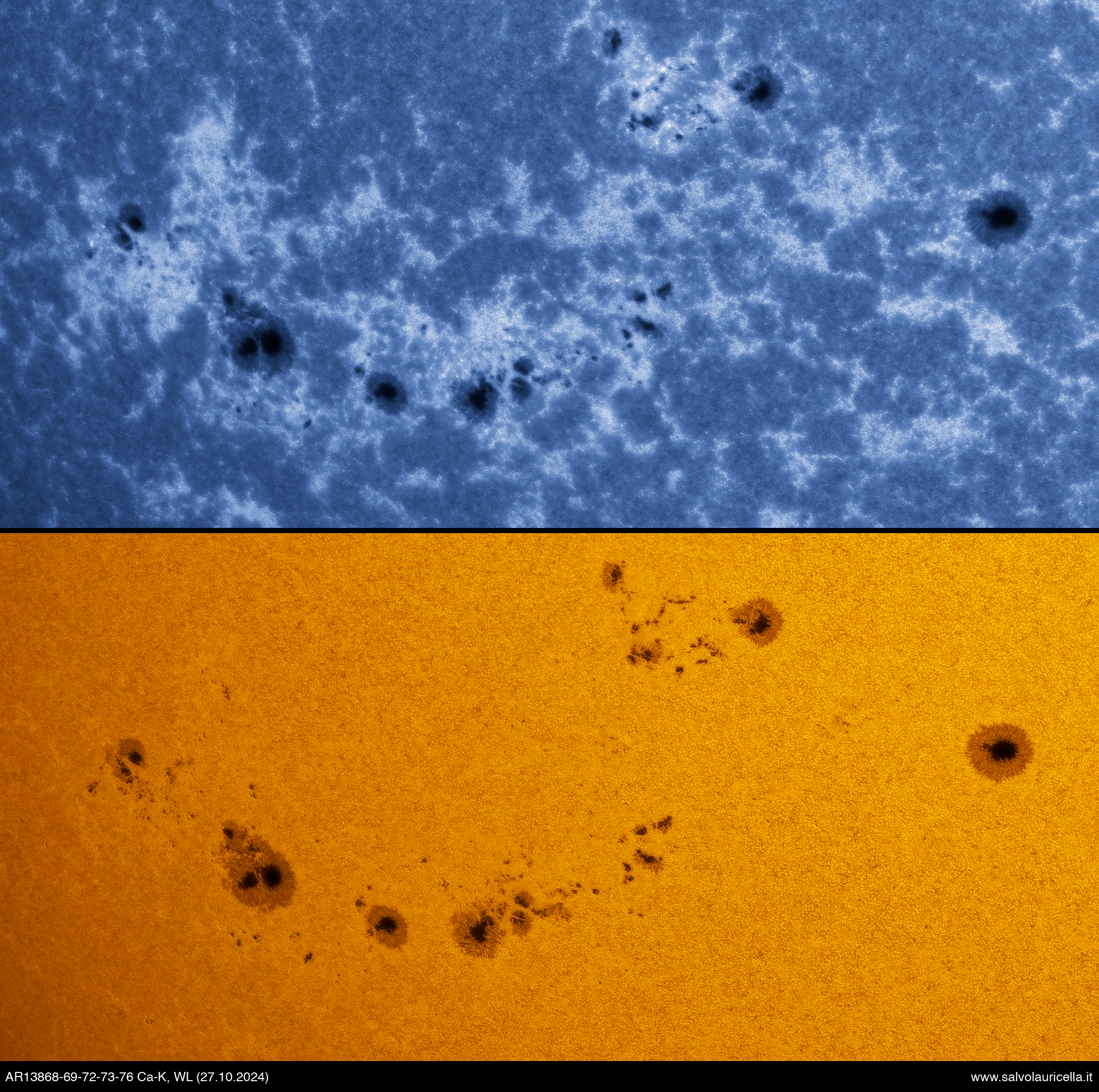 Active regions 13868-69-72-73-76 imaged on October 27, 2024 from Syracuse, Italy, in Ca-K line and white light.