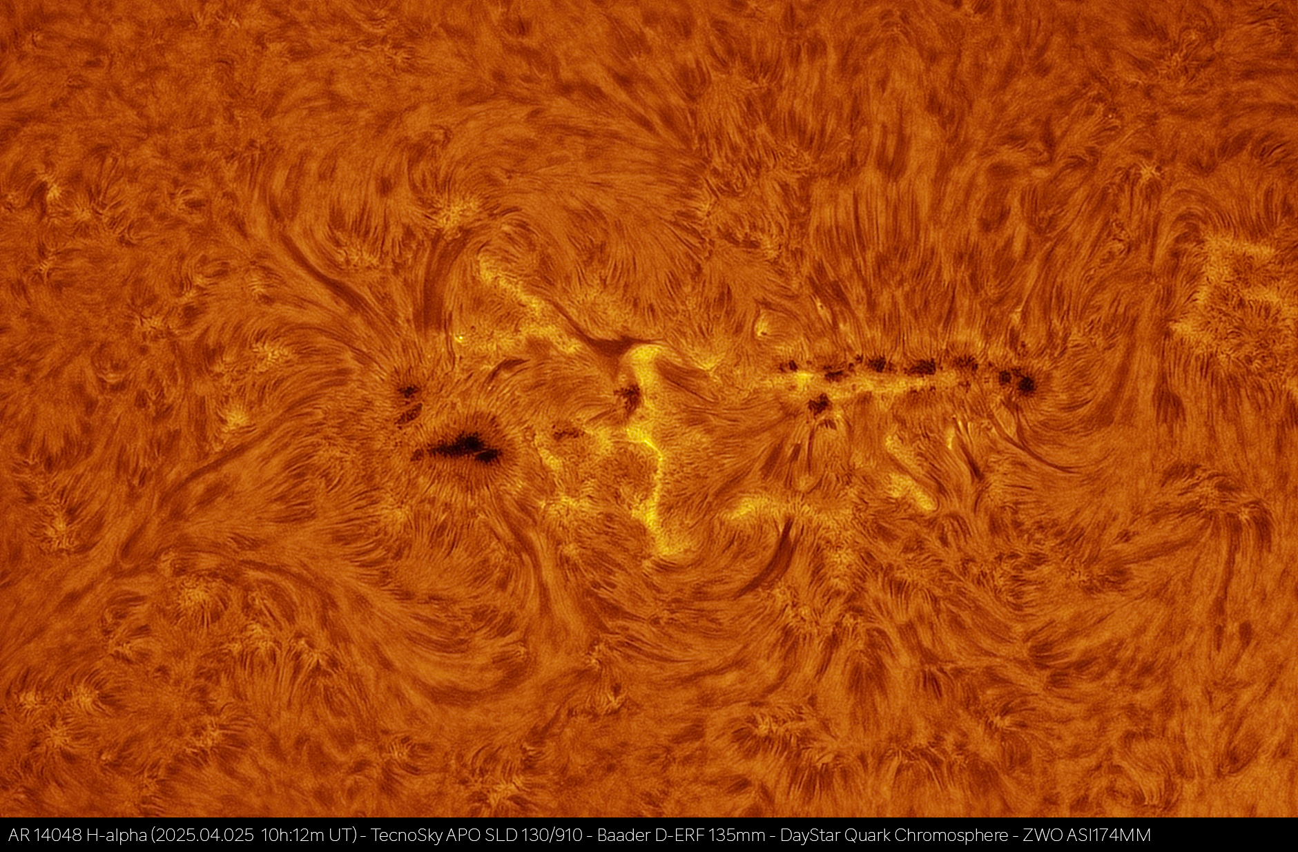 Active Region 14048 imaged in H-alpha on April 5, 2025 from Syracuse, Italy.