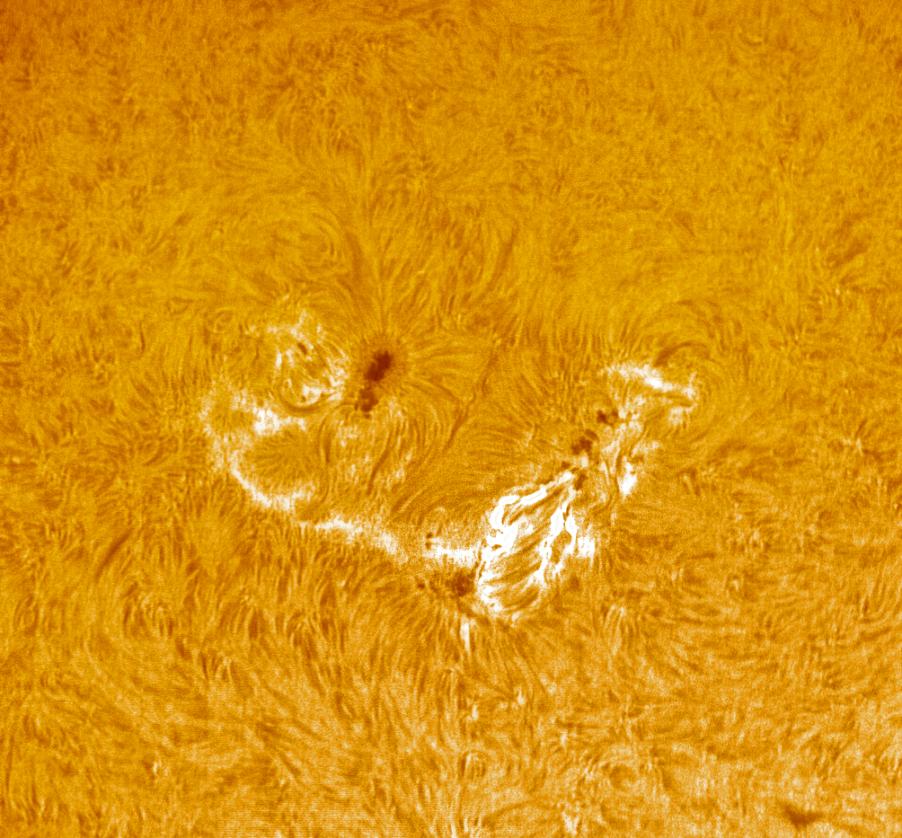 Hier das angekündigte Bild der Fleckengruppe AR 14165 + 14168 in der H-alpha-Linie mit dem besagten Energieausbruch. Unbeabsichtigt, aber witzig: Das Bild im Weißlicht wurde um 11:11 Uhr aufgenommen, dieses Bild kam um 12:12 Uhr zustande.