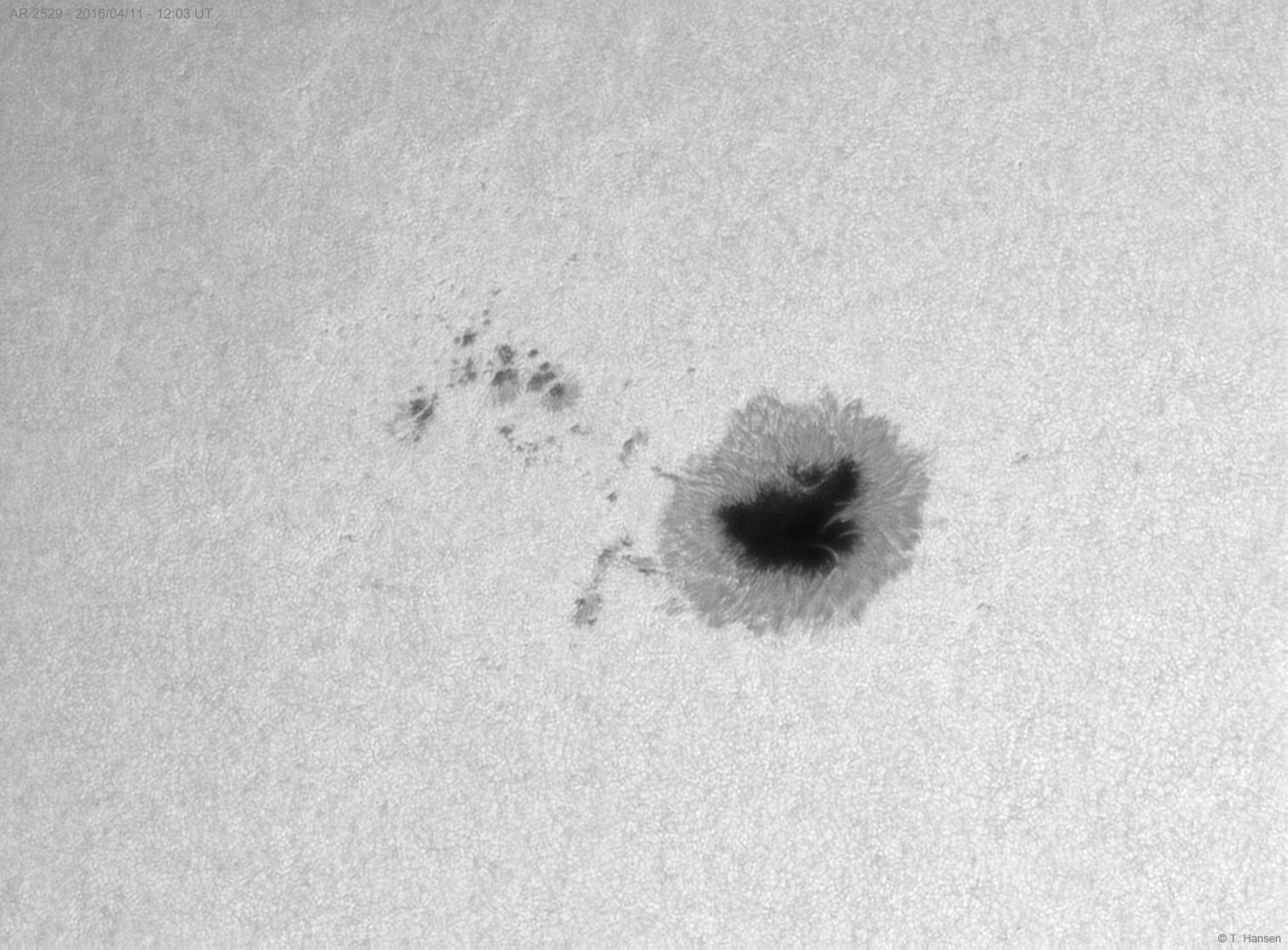 Der große Sonnenfleck erschien im Weißlicht am 11. April 2016 fast herzförmig. Mit 127 mm Öffnung waren fotografisch im Bereich von Umbra und Penumbra viele Details erfassbar.