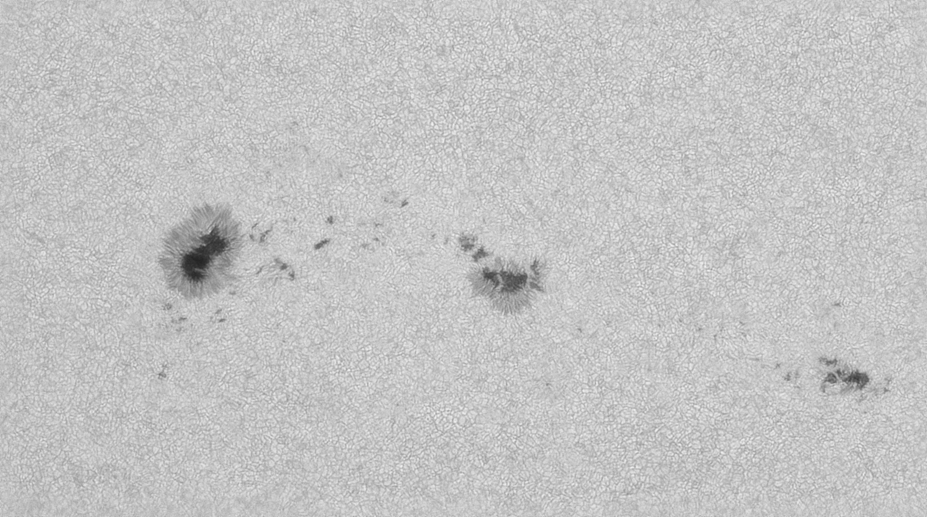 Eine Dreiergruppe an aktiven Regionen zeigte sich heute im Bereich des Zentralmeridians der Sonne. Bezeichnungen von links nach rechts AR 2959 - AR 2957 - AR 2961. Die Brennweite beträgt mit 3000 mm fast das Doppelte, als sie nach dem Abtasttheorem erfordelrich wäre. Die Bedingungen waren gut, so dass das Bild trotzdem einen scharfen Eindruck vermittelt.
