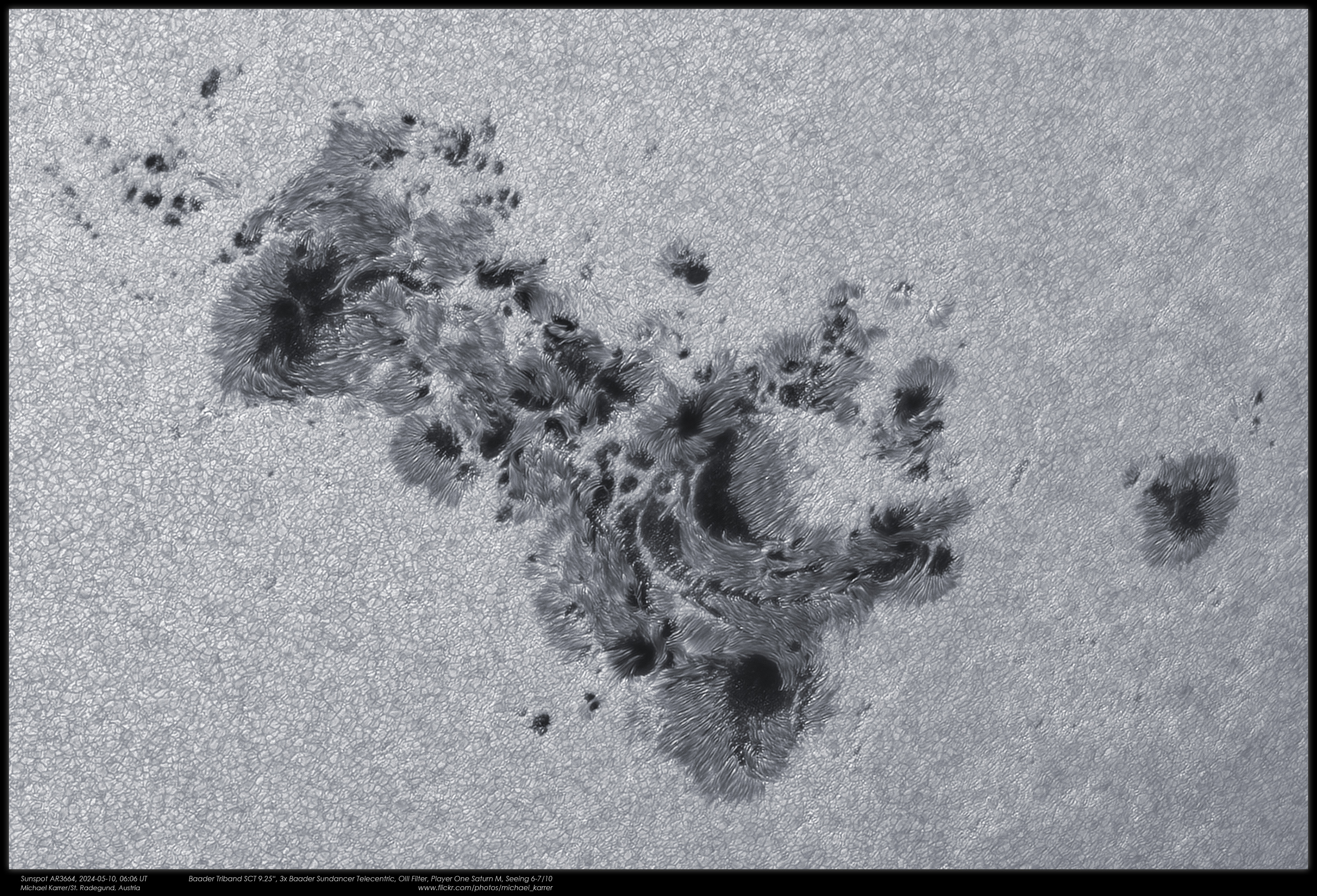 Bewegtes Seeing, aber mit ausreichend scharfen Momenten, so dass Autostakkert die besten Frames selektierte. Der gigantische Fleck zeigt viele Details in Umbra und Penumbra. Was für ein Erlebnis!