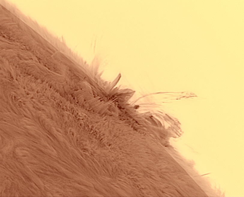 Sonnenfleck 4165 am Ostrand der Sonne, Invertierte und nachträglich colorierte Aufnahme in H-alpha