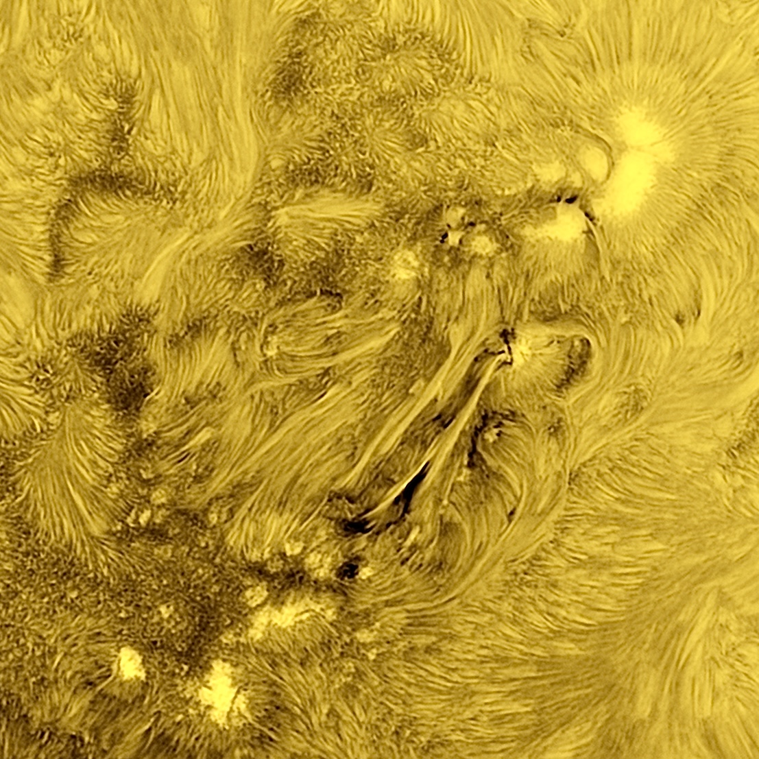 Faszinierendes Plasmaspiel in der aktiven Fleckengruppe AR 4197. Diese Aufnahme erfolgte invertiert und wurde anschließend eingefärbt.