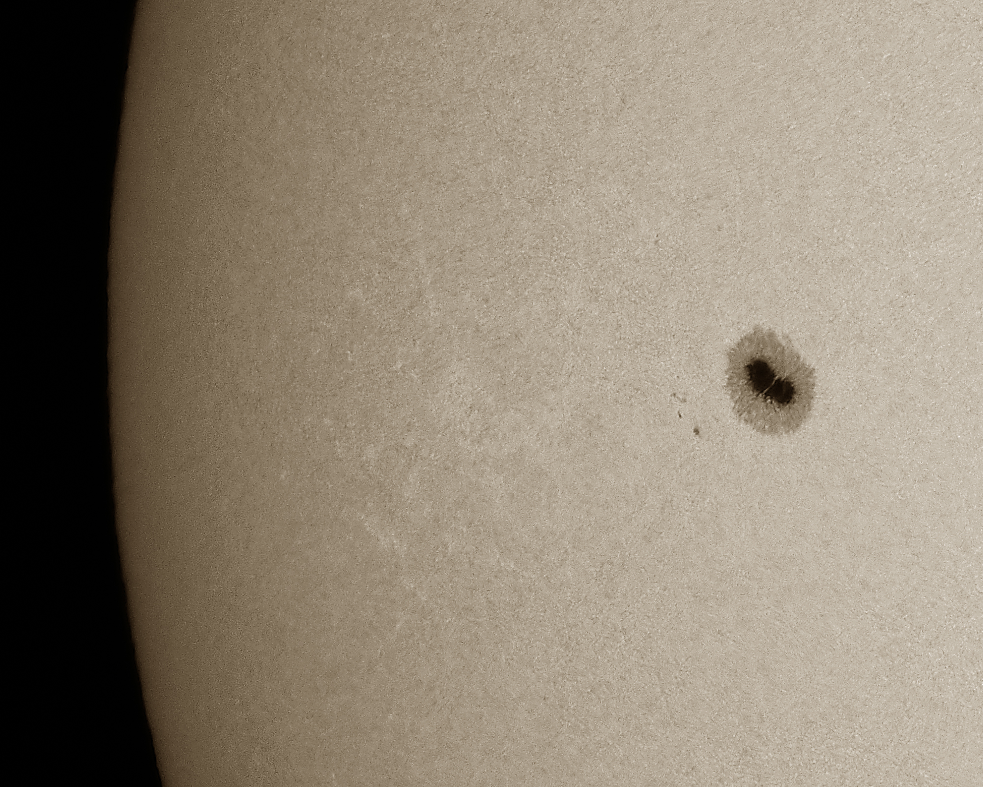 Endlich konnte ich mal wieder einen Sonnenfleck über mehrere Tage beobachten. Man brauchte etwas Geduld mit dem Seeing, aber einige kurze Momente reichten, um ein schönes Bild aufzunehmen. Auffällig ist eine durchgehende Lichtbrücke in der Umbra.