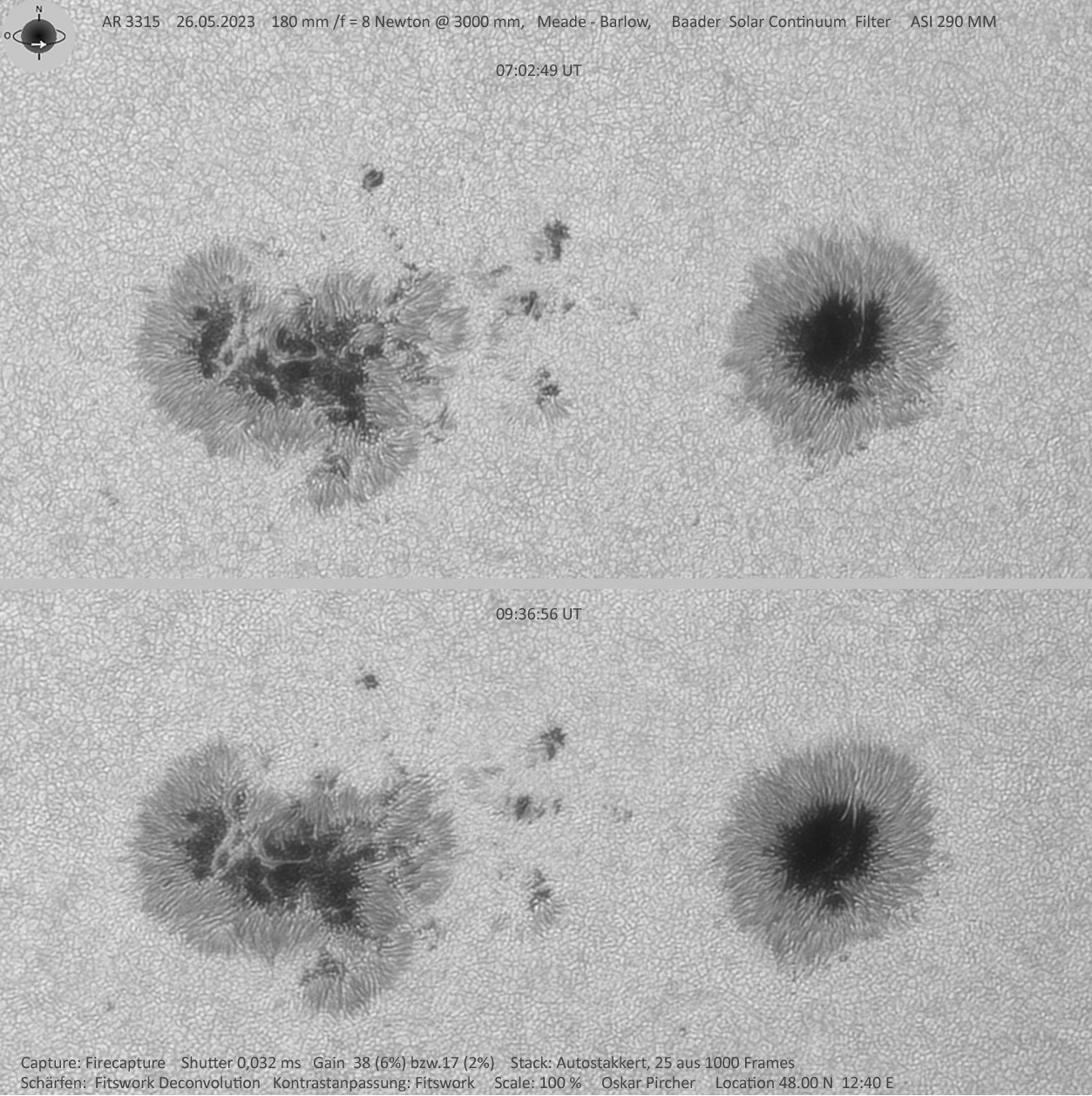 Der Sonnenfleck AR 3315 im Abstand von ca. 2,5 Stunden. Bei der späteren Aufnahme waren die Bedingungen wegen der unruhigeren Luft deutlich schlechter, das konnte der höhere Sonnenstand nicht ausgleichen.