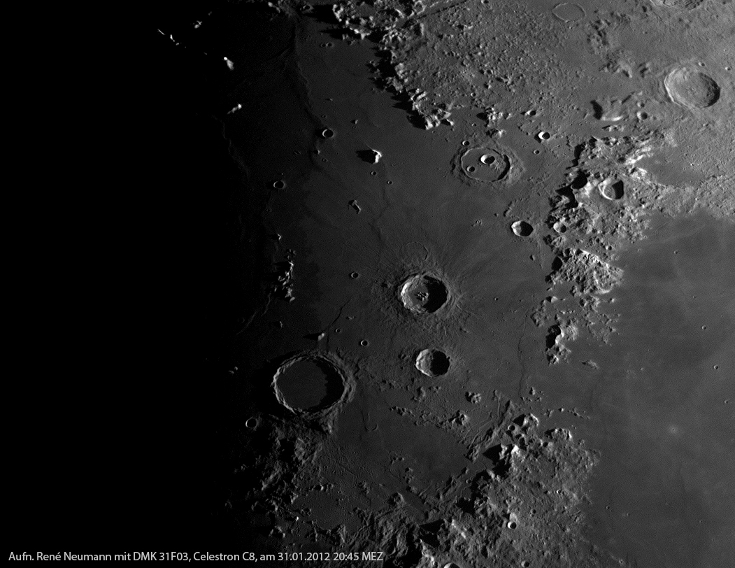 Das Bild ist Teil meines Mond-Mosaiks vom 31.1.2012 und zeigt wie detailreich die Gesamtaufnahme ist. Sehr schön hier die Krater Archimedes, Aristillus, Autolycus zusammen mit Montes Apenninus, sowie oberhalb Montes Alpes.