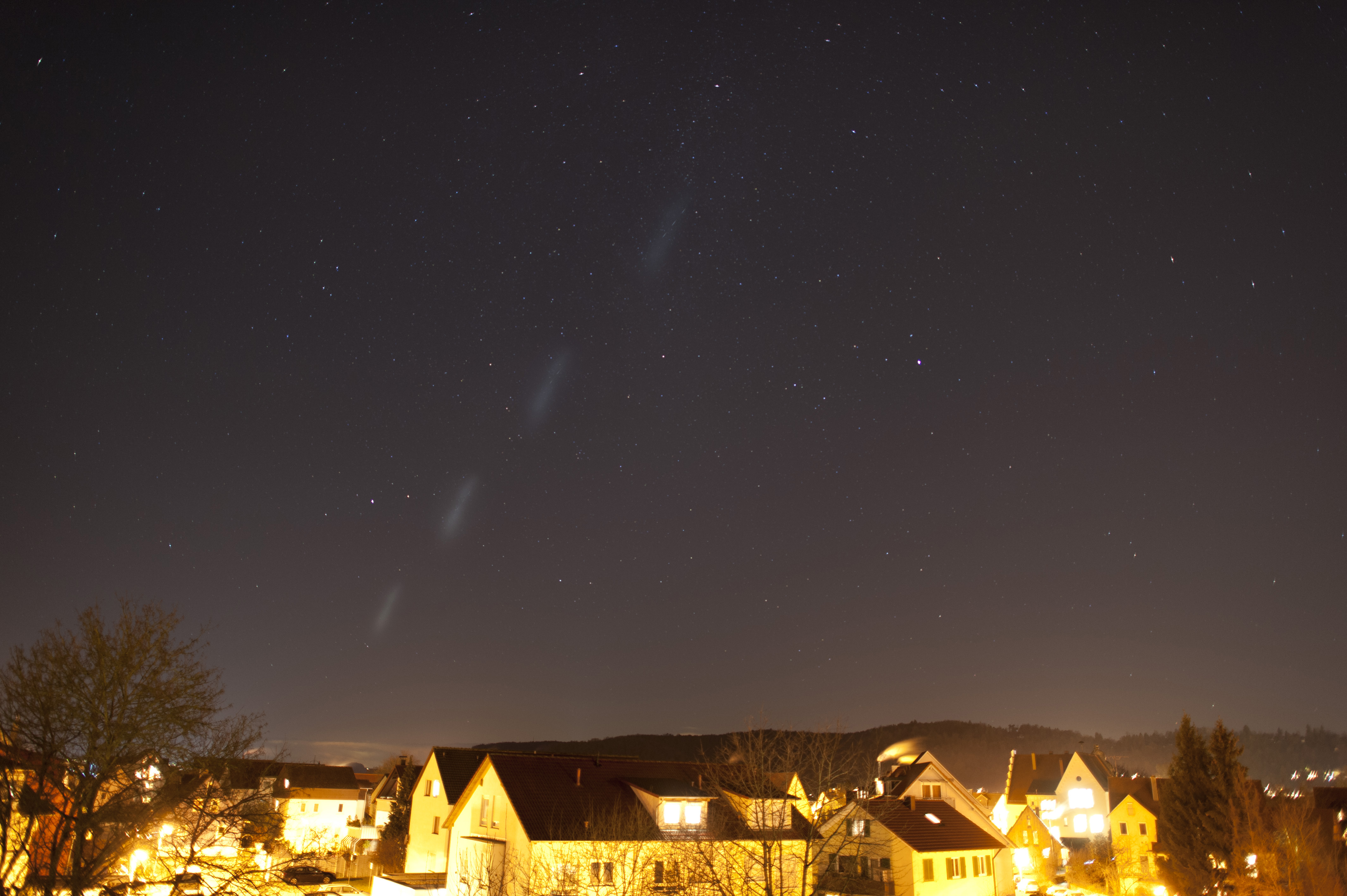 Eigentlich sollte der Himmel auf Meteore der Geminiden überwacht werden. Stattdessen flog am 12. Dezember 2017 gegen 19:55 Uhr MEZ dieses kuriose Wölkchen über den Westhimmel von Tübingen. Vier Aufnahmen a acht Sekunden Belichtung und mit einem Zeitabstand von jeweils 50 Sekunden sind hier gezeigt. Im Zentrum des Wölkchens ist jeweils die Spur eines offensichtlich rotierenden Satellitens zu erkennen. Etwas Recherche brachte den Urheber zutage. Um 19:37 Uhr MEZ startete eine Ariane-5-Rakete mit vier Galileo-Satelliten vom europäischen Weltraumbahnhof in Kourou. Und keine 20 Minuten später war vermutlich eine Raketenstufe mit Treibstoffresten über Deutschland zu sehen.