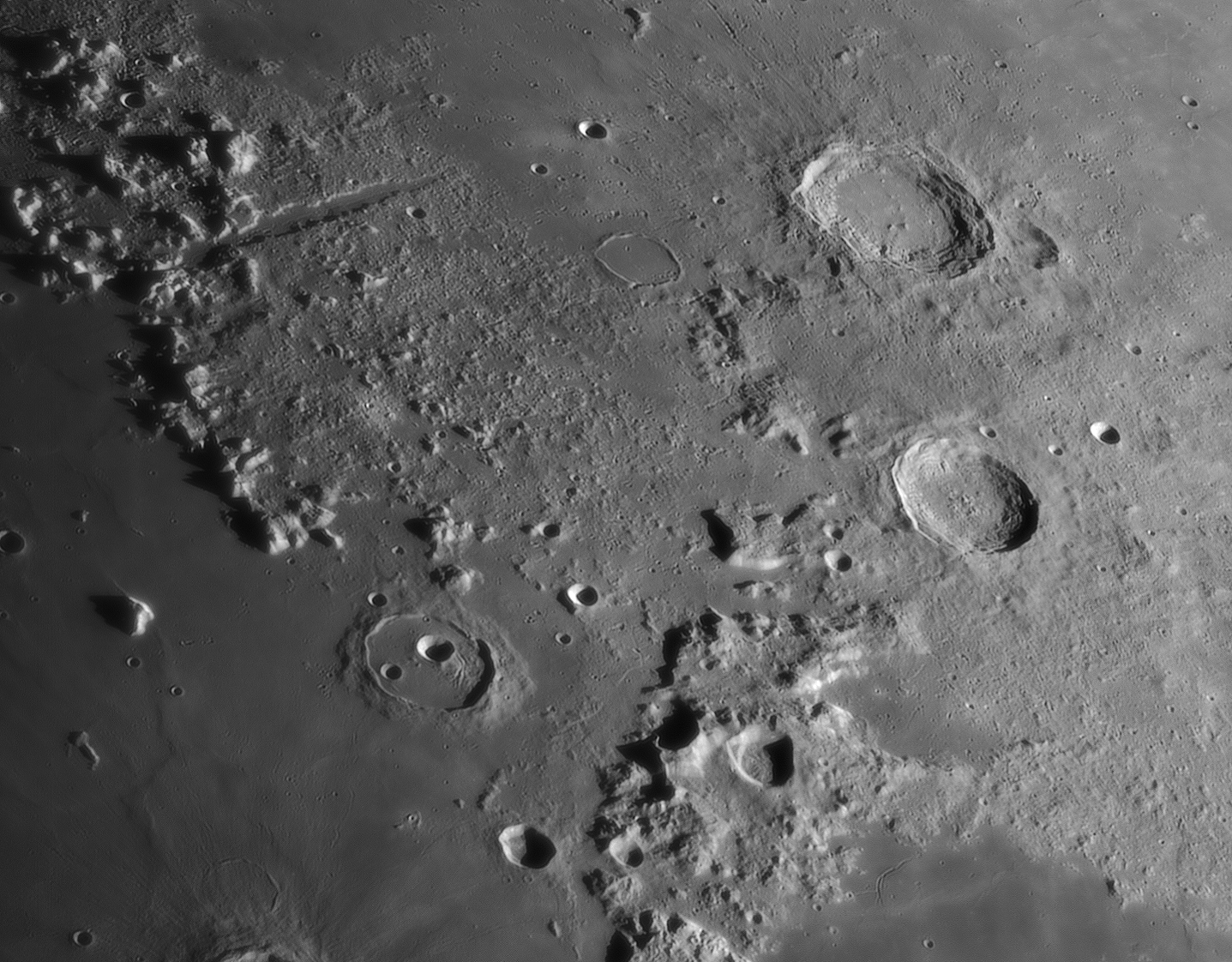 Die Terassen der Kraterwälle von Aristoteles und Eudoxus, das Alpental mit seiner Rille sowie die Rimae Theaetetus nördlich des gleichnamigen unregelmäßigen Kraters sind nur einige der feinen Details, die ich am 1. April 2020 ablichten und zu diesem Mosaik aus vier Aufnahmen zusammenstellen konnte.