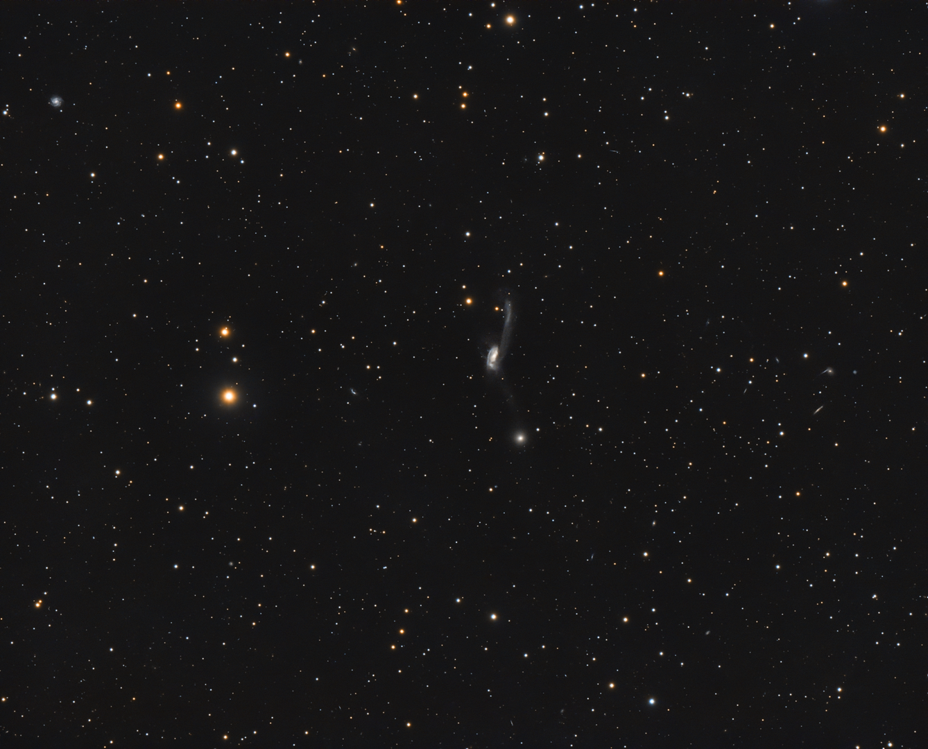 Über dieses interessante Objekt, miteinander interagierendes Spiral-/Ellipsengalaxienpaar wurde erstmals im »Catalogue of Peculiar Galaxies« von Halton Arp im Jahr 1966 geschrieben. Es ist auch als Paar Nummer 508 in Igor Karachentsevs Katalog der Doppelgalaxien vermerkt. Die große Spiralgalaxie (Typ SABb pec) zeigt lange Gezeitenschweife, die durch ihre Interaktion mit der südlichen Galaxie verursacht werden. Tatsächlich ist diese elliptische Galaxie trotz ihres unscheinbareren Aussehens die viel interessantere. Es handelt sich um eine Broadline-Radiogalaxie mit einem unaufgelösten Kern und einer VLBI-Komponente im Sub-Parsec-Bereich bei 6 cm. Sie ist außerdem eine Seyfert-Galaxie mittleren Typs, das heißt sie hat einen aktiven Kern, und sie zeigt ein Emissionslinienprofil mit zwei Gipfeln (Abstand etwa 5000 km/s), was als starker Hinweis auf das Vorhandensein einer Akkretionsscheibe gilt, wahrscheinlich um ein zentrales extrem massereiches Schwarzes Loch. Auf diesem Bild sehen wir auch die Existenz zahlreicher weiter entfernter Hintergrundgalaxien. Arp 102 liegt in einer Entfernung von ungefähr 320 Millionen Lichtjahren.