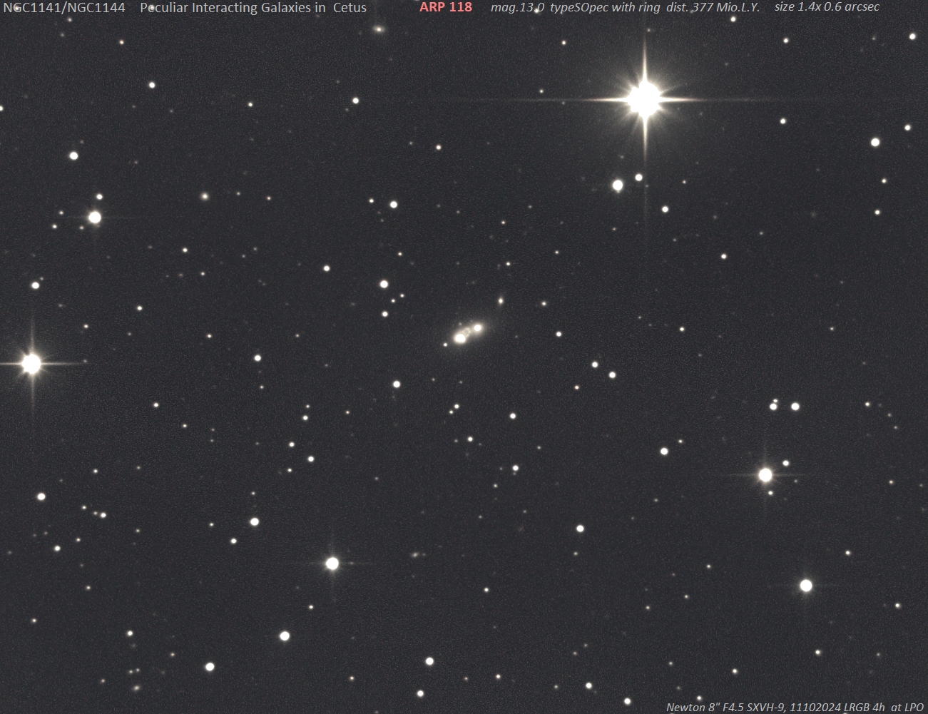 Dieses irreguläre Galaxienpaar befindet sich 4,5 Grad südlich von Menkar (Al Ceti). Bei der Bezeichnung gab es einige Unstimmigkeiten. Es wird auch als NGC 1141/NGC 1142 bezeichnet. H.C. Arp nahm es unter der Nummer 118 in seinen Galaxienkatalog auf unter Elliptische Galaxien nahe bei Spiralgalaxien und diese nicht störend! Sic!! Die scheinbaren Helligkeiten beider Komponenten betragen 13,1, bzw. 14,1 Größenklassen, ihr Typ ist S0pec (ring). Die scheinbare Größe beträgt nur 1,4 x 0,6 Bogenminuten! Die Entfernung beträgt 370 Millionen Lichtjahre. Entdeckt wurde das Objekt von Albert Marth mit einem 120-cm-Spiegelteleskop am 5. Oktober 1864 und später von Edouard Stephan 1876. Der lineare Abstand beider Komponenten beträgt 20 kpc. Ein schönes Bild gibt es vom Hubble Space Telescope (siehe Wikipedia).