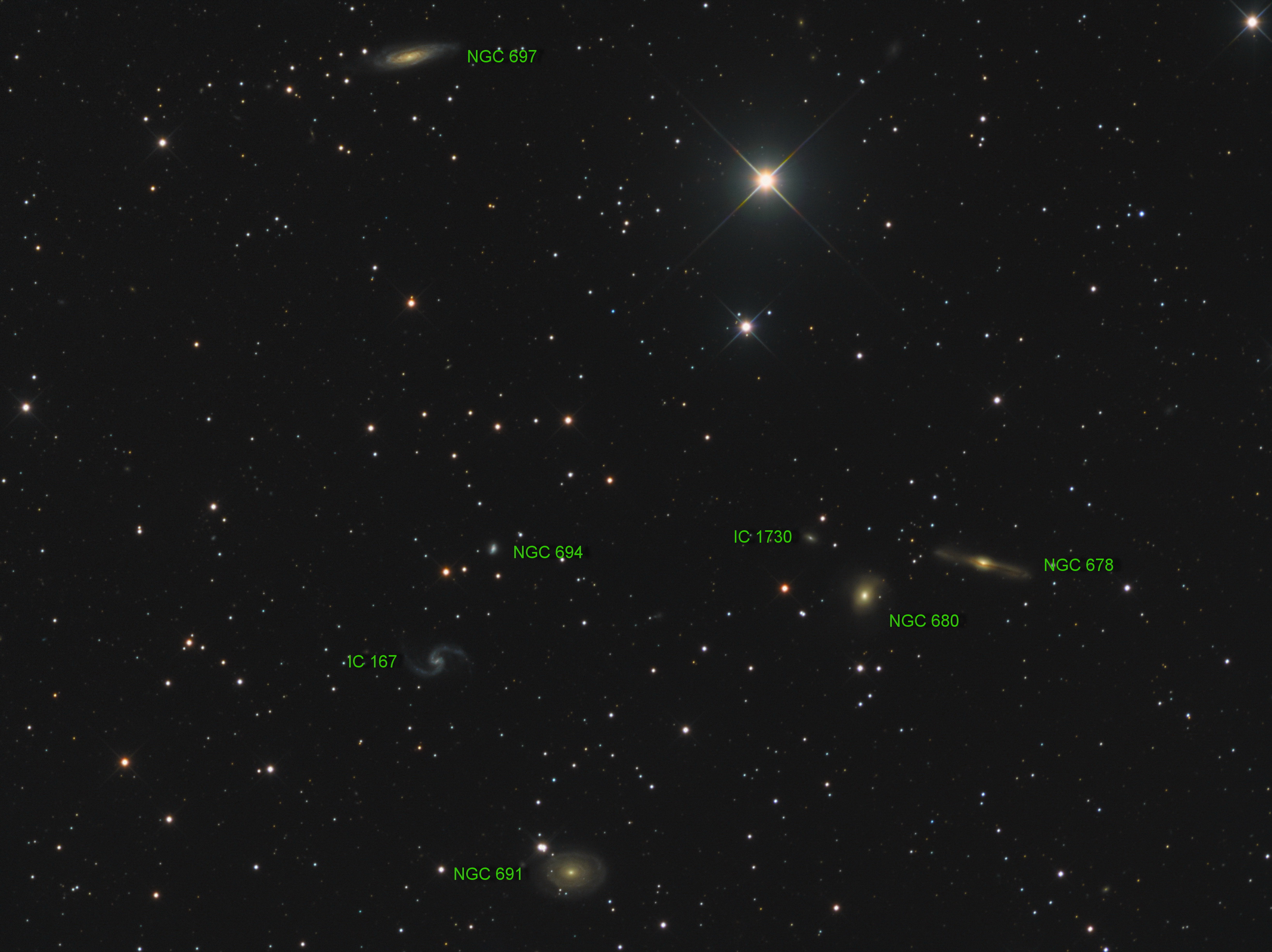 IC 167 (in Dreyers first index catalogue) ist eine Balken-Spiralgalaxie vom Hubble-Typ SBc im Sternbild Widder auf der Ekliptik. Sie ist etwa 61 Millionen Lichtjahre entfernt und hat einen Durchmesser von etwa 105000 Lichtjahren. In Halton Arps Katalog gehört sie zur Klasse der »Spiralgalaxien in Form des Integralzeichens«. Die weiteren Galaxien im Bild gehören zur NGC 691 – Gruppe und sind durchschnittlich 140000 Lichtjahre entfernt. Die Namensgeberin NGC 691 liegt fast in Aufsicht und hat einen Durchmesser von 120000 Lichtjahren. Sie zeigt mehrere ringförmige Strukturen, im Infraroten mindestens drei.
