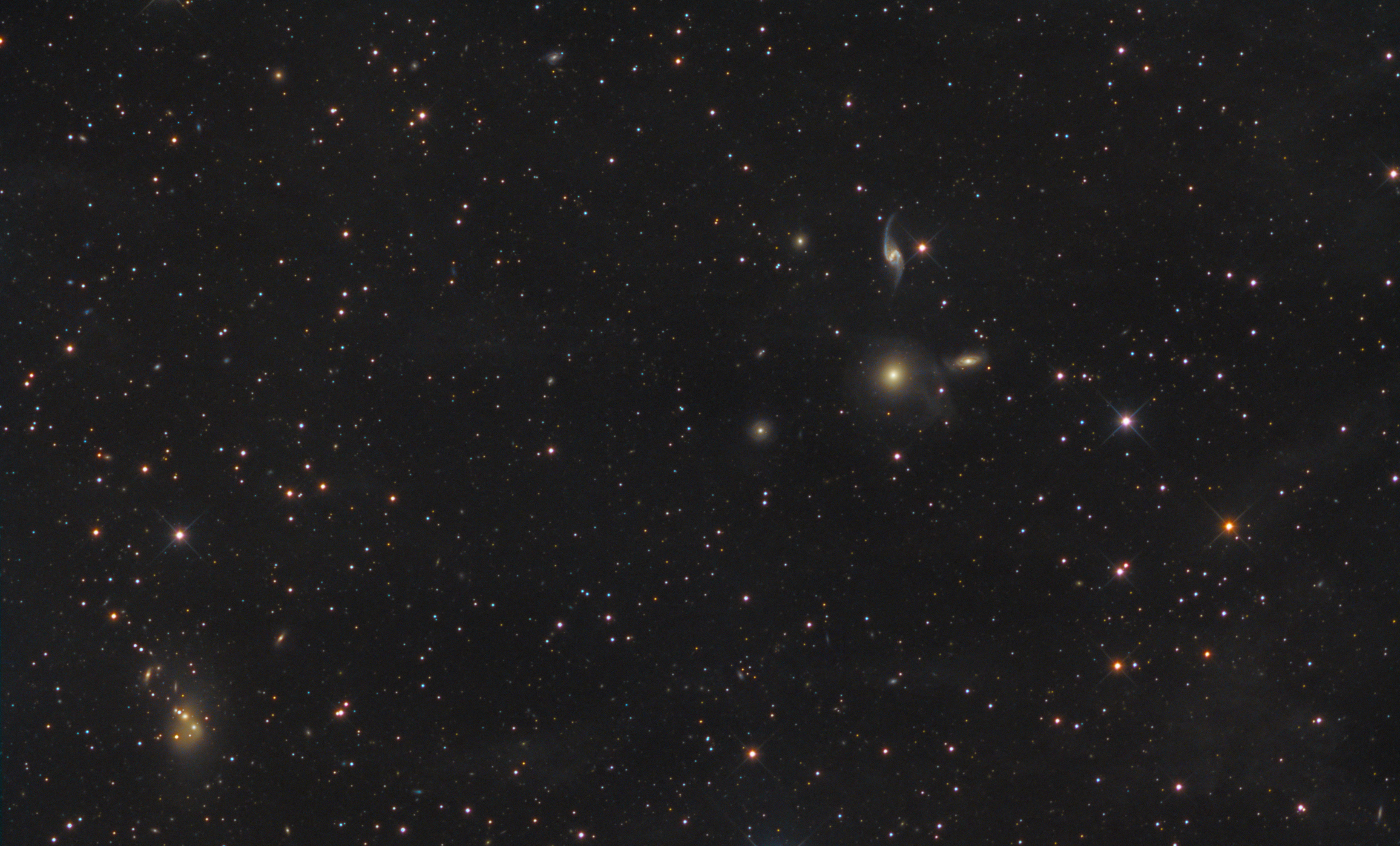 Im Sternbild Pegasus liegen zwei Gruppen von Arp-Galaxien zwar im gleichen Bildfeld, aber in ganz verschiedener Entfernung. Während Arp 99 (rechts oben) 235 Millionen Lichtjahre entfernt ist, bringt es Arp 170 (links unten) auf 550 Millionen Lichtjahre.