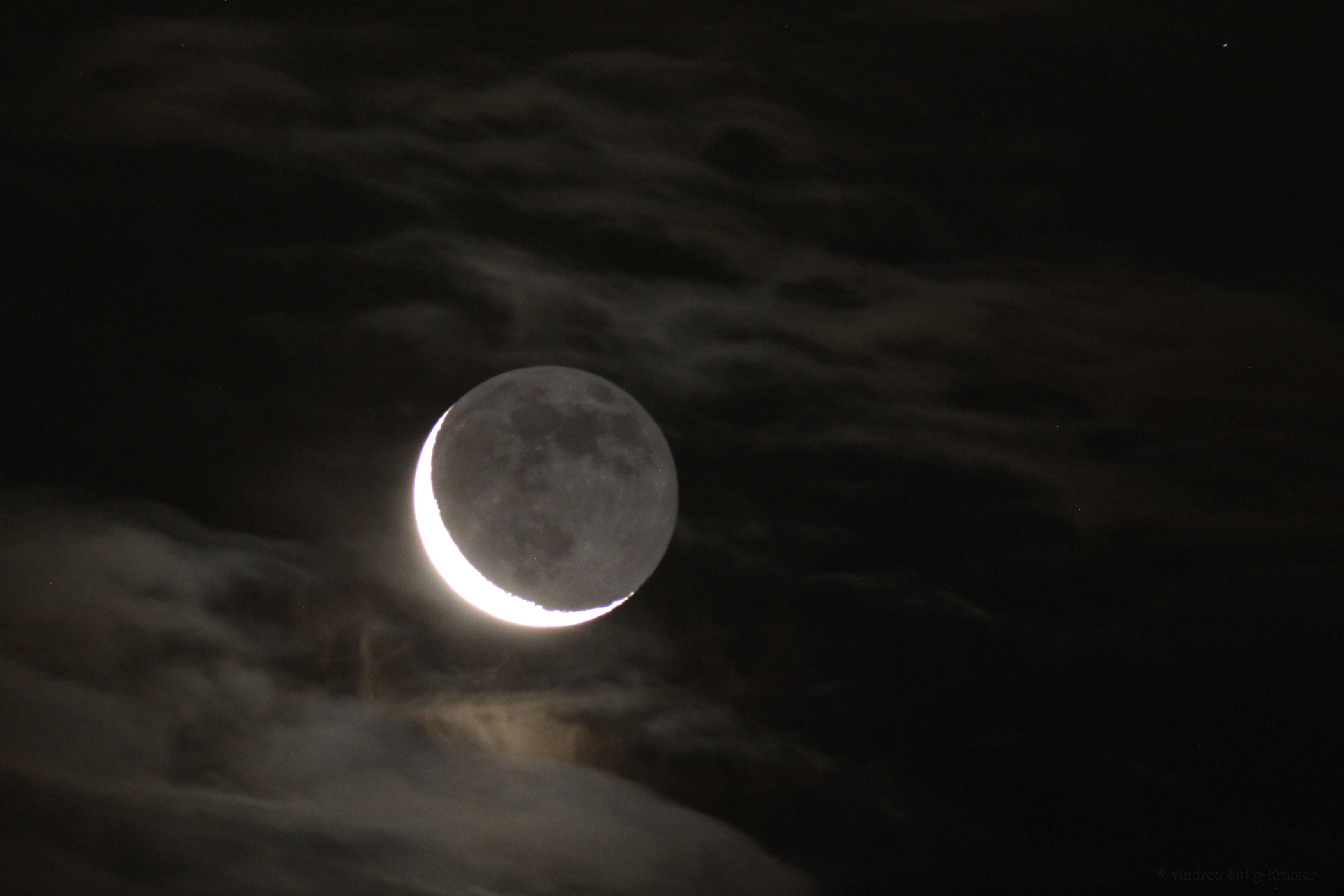 Dieses eindrucksvolle Licht-Phänomen entsteht, wenn die Sonne unter einem bestimmten Winkel knapp unter dem Horizont steht. Das Sonnenlicht wird von der Erde reflektiert und auf die unbeleuchtete Fläche des Erdtrabanten geworfen. Dieses Licht wird wiederum von der Mondoberfläche reflektiert, und wir können das so genannte "aschgraue Mondlicht" bewundern.