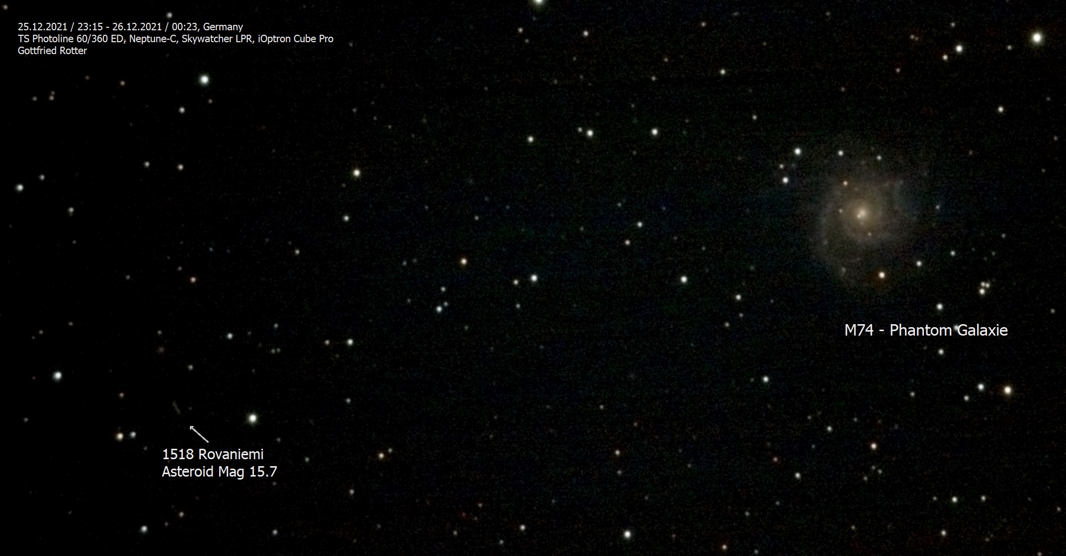 In der Nacht vom 25. auf den 26. Dezember 2021 war nach Wochen die erste klare Nacht. Unter anderem versuchte ich mich auch an der Phantomgalaxie M74, ein nicht sehr einfaches Objekt. Bei der ersten Sichtung der Bilder fiel es erst gar nicht auf. Aber manchmal sollte/muss man zweimal hinschauen, die richtigen Fragen stellen und Leute kennen, die sich auskennen. Habe ich doch auf der einen Aufnahme glatt einen Asteroiden mit ablichten können. Naja, zumindest seine Spur. Ist ja auch nur acht Kilometer groß und rund 300 Millionen Kilometer entfernt.