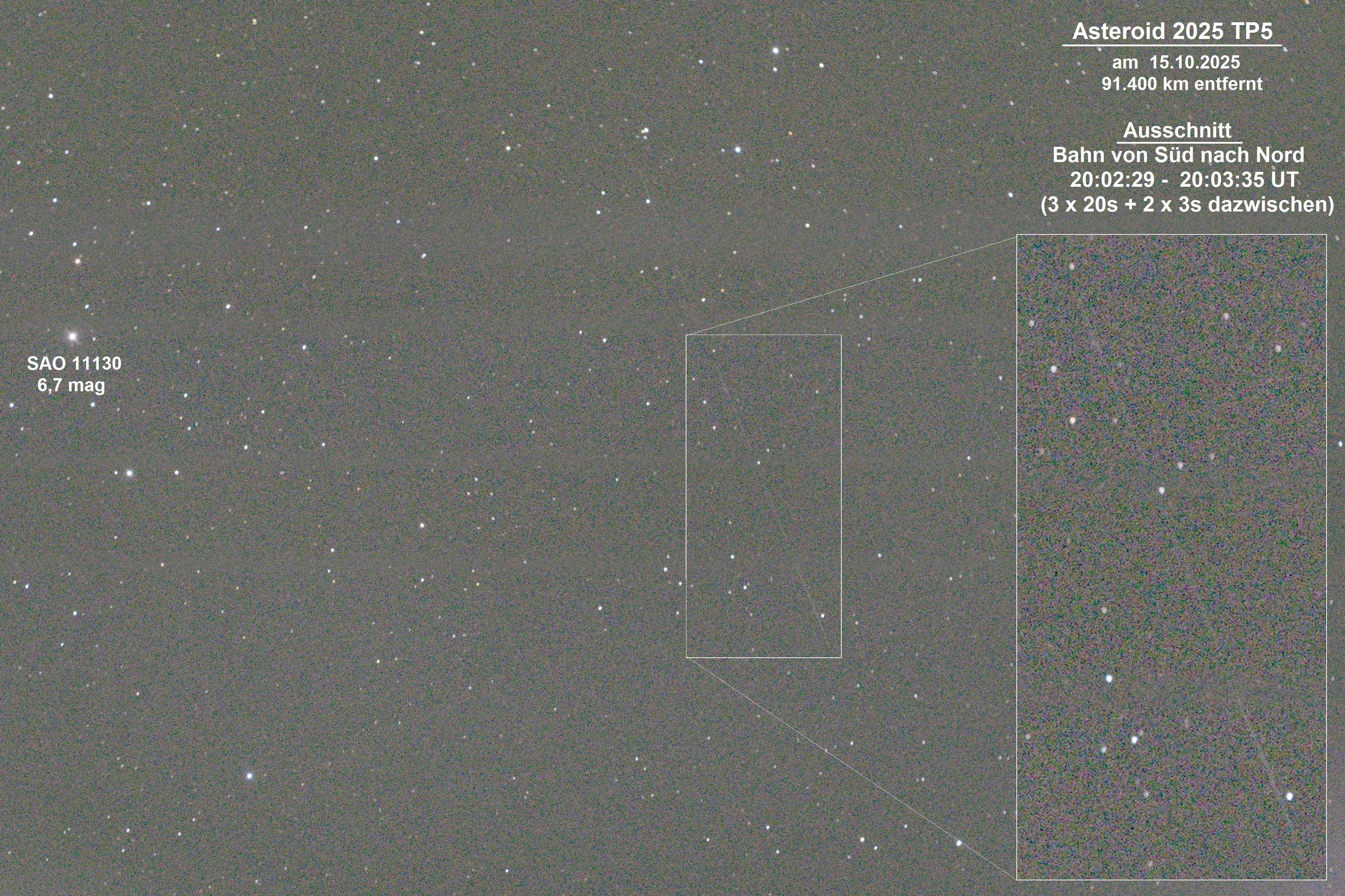 Als ich am 15. Oktober 2025 auf der Homepage von SpaceWeather die Daten dieses Asteroiden gesehen hatte, mit nur 0,3 Mondentfernungen, hoffte ich für den Abend auf freien Blick hoch Richtung Norden. Und bereitete mich schon genau vor, trotz mäßiger Wetteraussichten. Und doch klarte es am späteren Abend auf, und ich konnte ihn an der Grenze von Kassiopeia und Kepheus anpeilen und mehrere 20s-Aufnahmen jeweils mit 3s Pause machen (Canon 1000da, ISO 1600, am 203/812-mm-Schmidt-Newton). Der erdnahe Asteroid war erst zwei Tage vorher vom ATLAS-System entdeckt worden, war bei meinen Aufnahmen 12,6 mag hell und zog je Minute 18,9 Bogenminuten weit. Jedes »Strichchen« von 20s war somit 6,1 Bogenminuten lang. Dabei war er von mir nur 91400 Kilometer entfernt. Er soll etwa 13 bis 39 Meter groß sein (etwa wie der Tscheljabinsk-Meteor), seine Geschwindigkeit betrug über 30200 Kilometer pro Stunde.