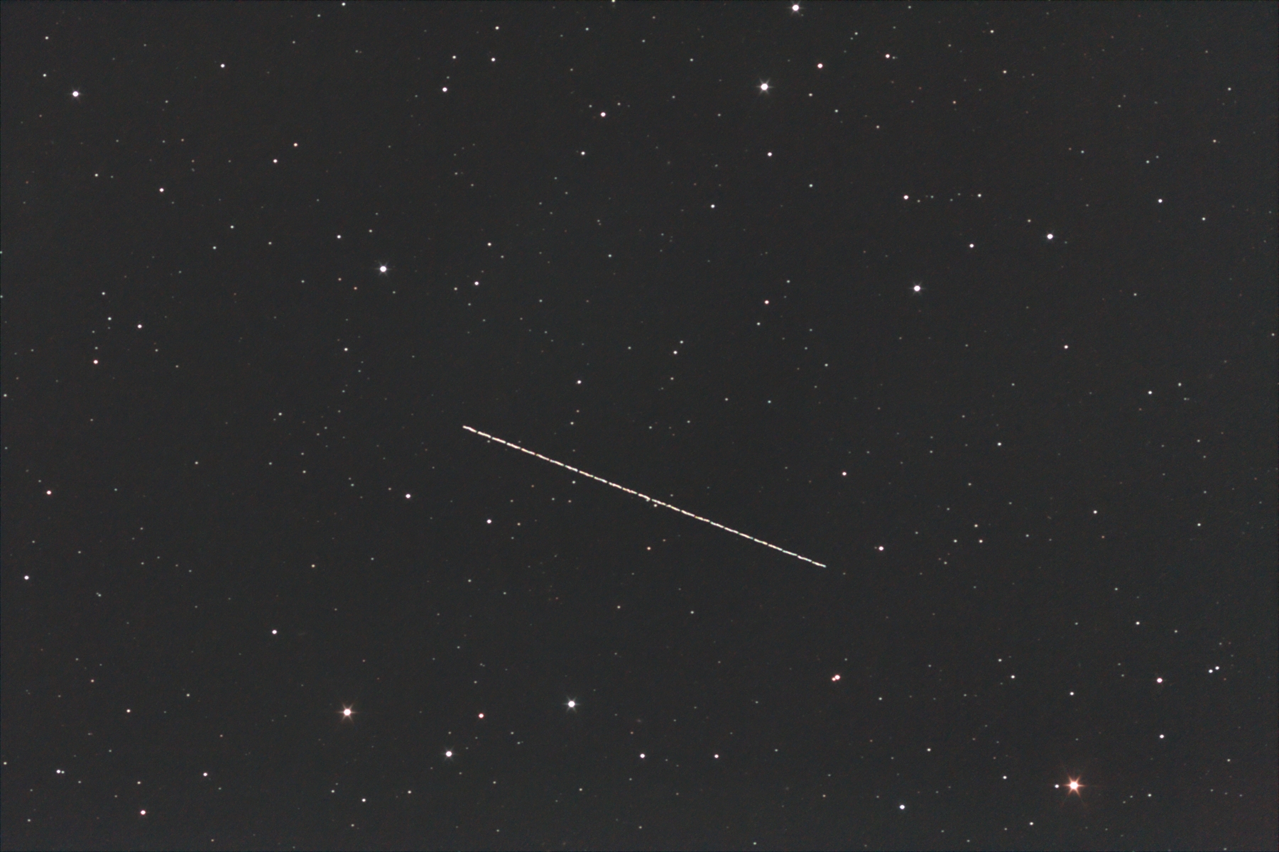 Apollo-Asteroid (4179) Toutatis mit 0,0465 AE in Erdnähe. Die Strichspur zeigt die 86 Min. lange Bahn im Sternbild Fische von 18:47 bis 20:03 MEZ. Der helle Stern rechts unten ist SAO 110024