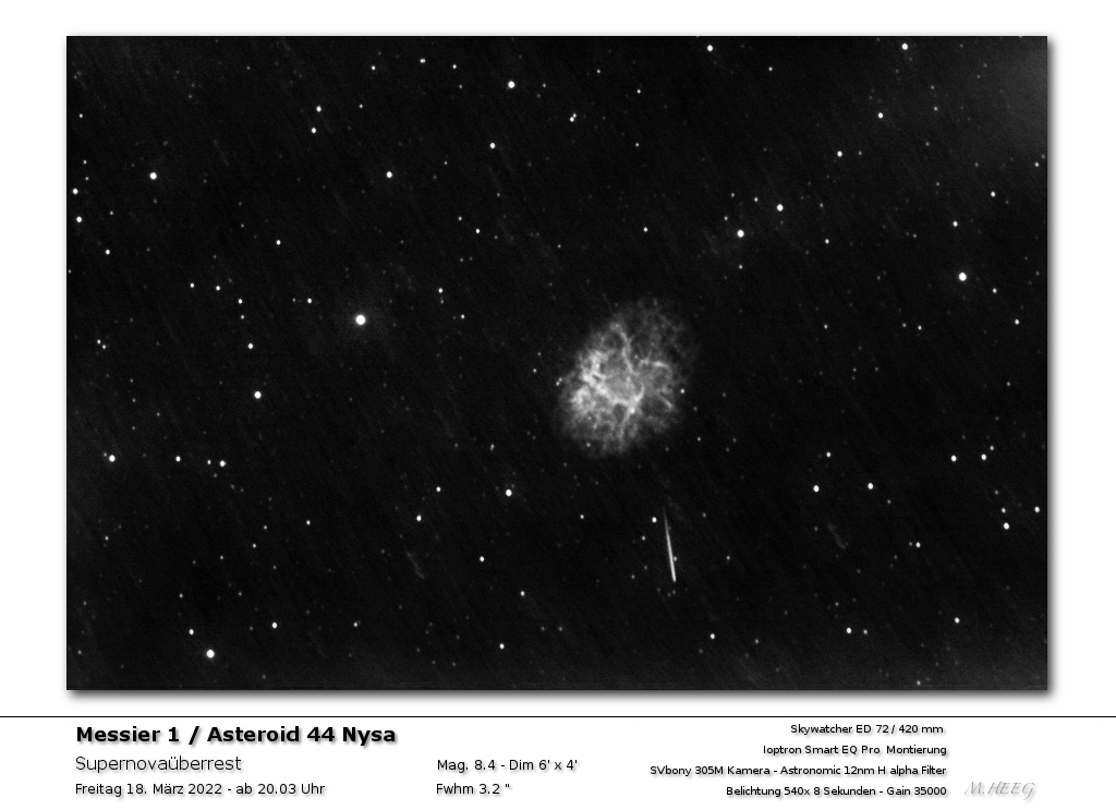 Seit vielen Jahren beobachte ich den Himmel astronomisch. Verwendet wurde für diese Beobachtung mein Skywatcher 420/72 Ed mit meiner SVBony 305m Pro Kamera. mit Astronomik 12 nm H-Alpha-Filter. So konnte ich dieses Ereignis "festhalten". Es zeigt den Asteroiden nahe beim Krebsnebel. Eine Situation welche so (wenn überhaupt) erst in einigen Jahren wieder zu sehen sein wird. Die abgelichtete Bahn des Asteroiden zeigt seine Bewegung in ca. 72 Minuten, aus 8 Sec. Einzelbelichtungen. Details siehe je in der Bildunterschrift.