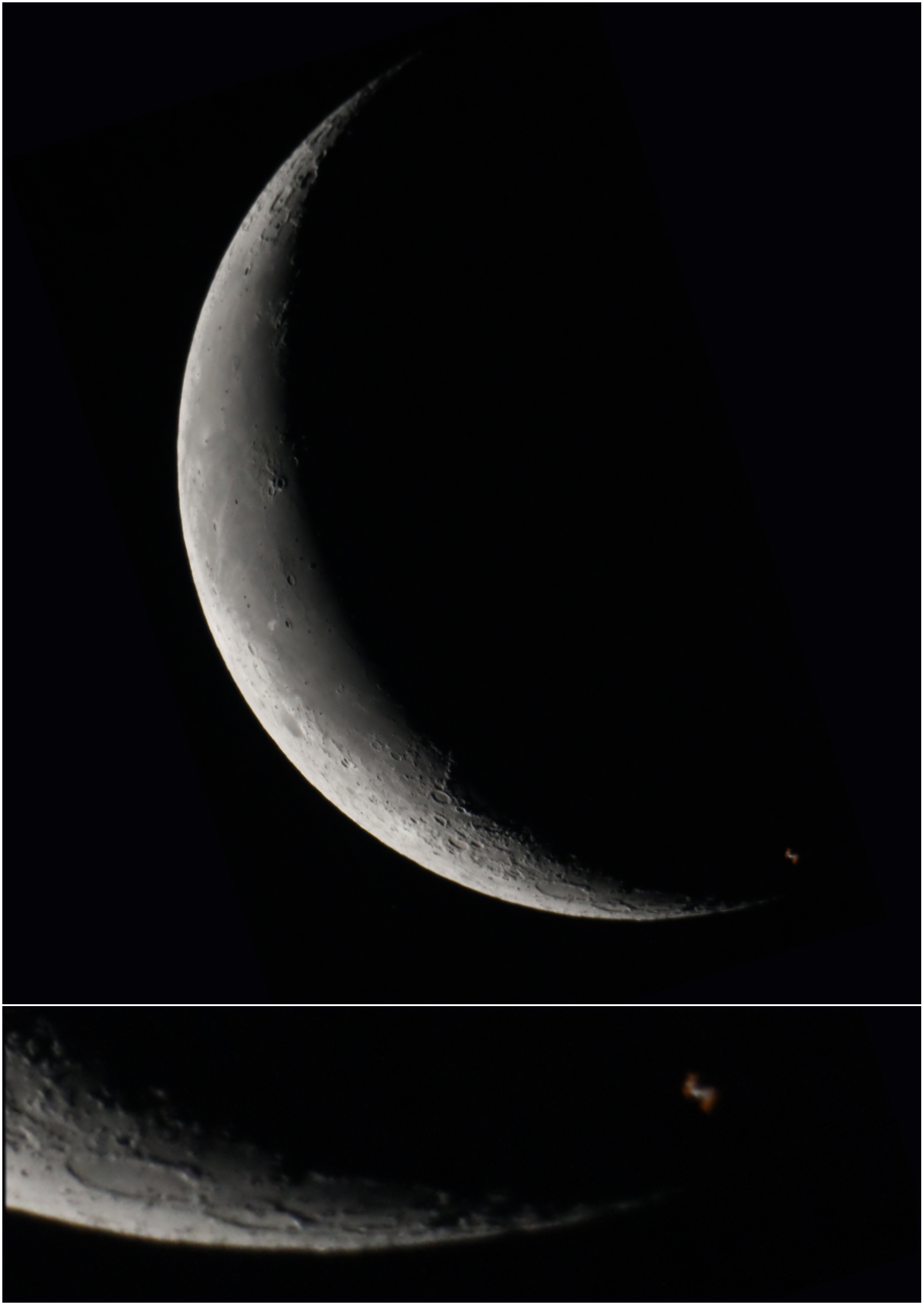 An der vhs-Sternwarte wurde es jedoch knapp mit dem Transit. Die ISS schrammte geradezu an der Spitze der Sichel vorbei. Hier das dazugehörige Bild.