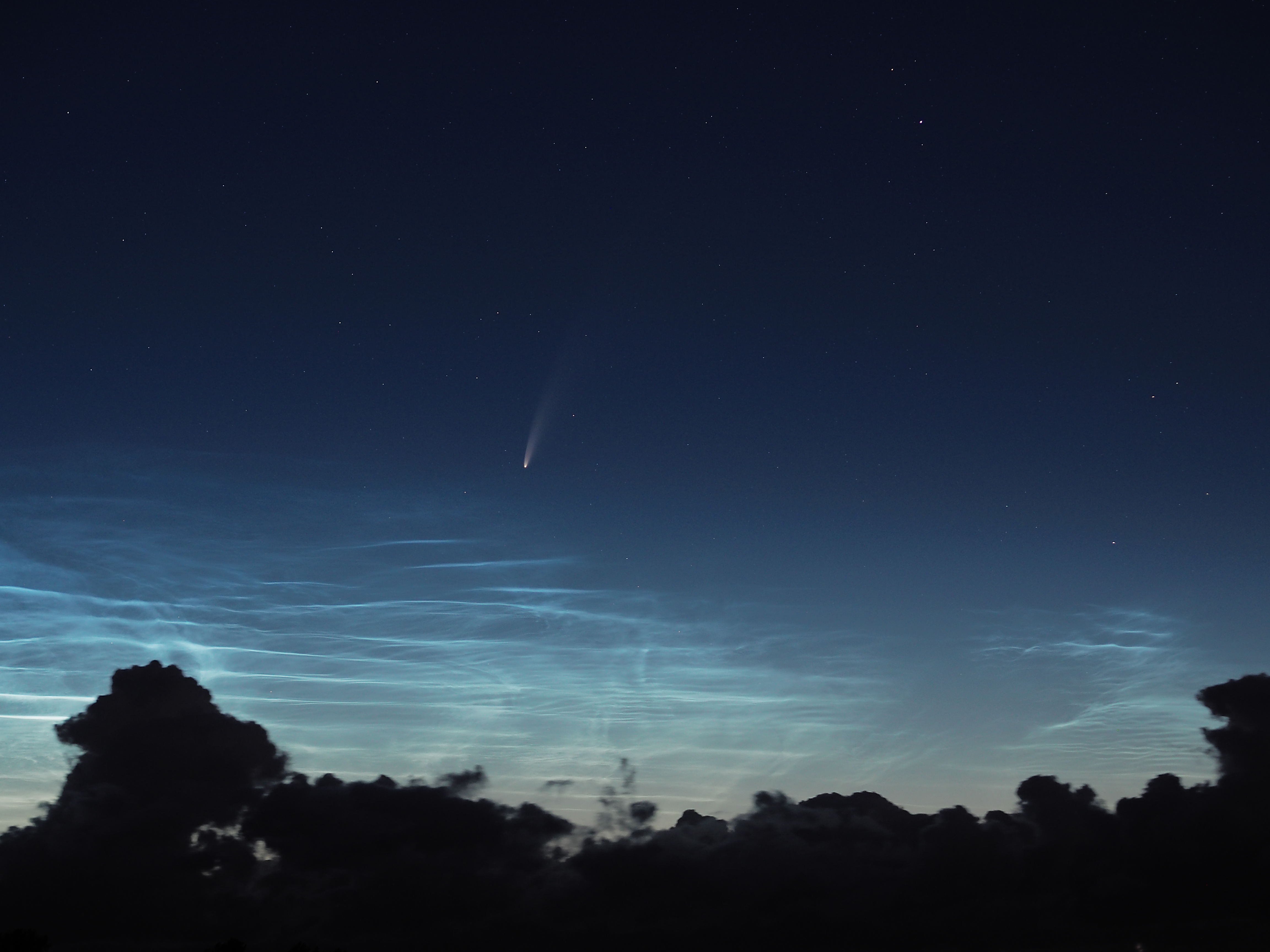 Eigentlich doppelt auf Wolken gebettet, zum Glück waren die dunklen Wolken unterhalb der leuchtenden Nachtwolken. Und darüber der Komet, ein sehr schöner Anblick.