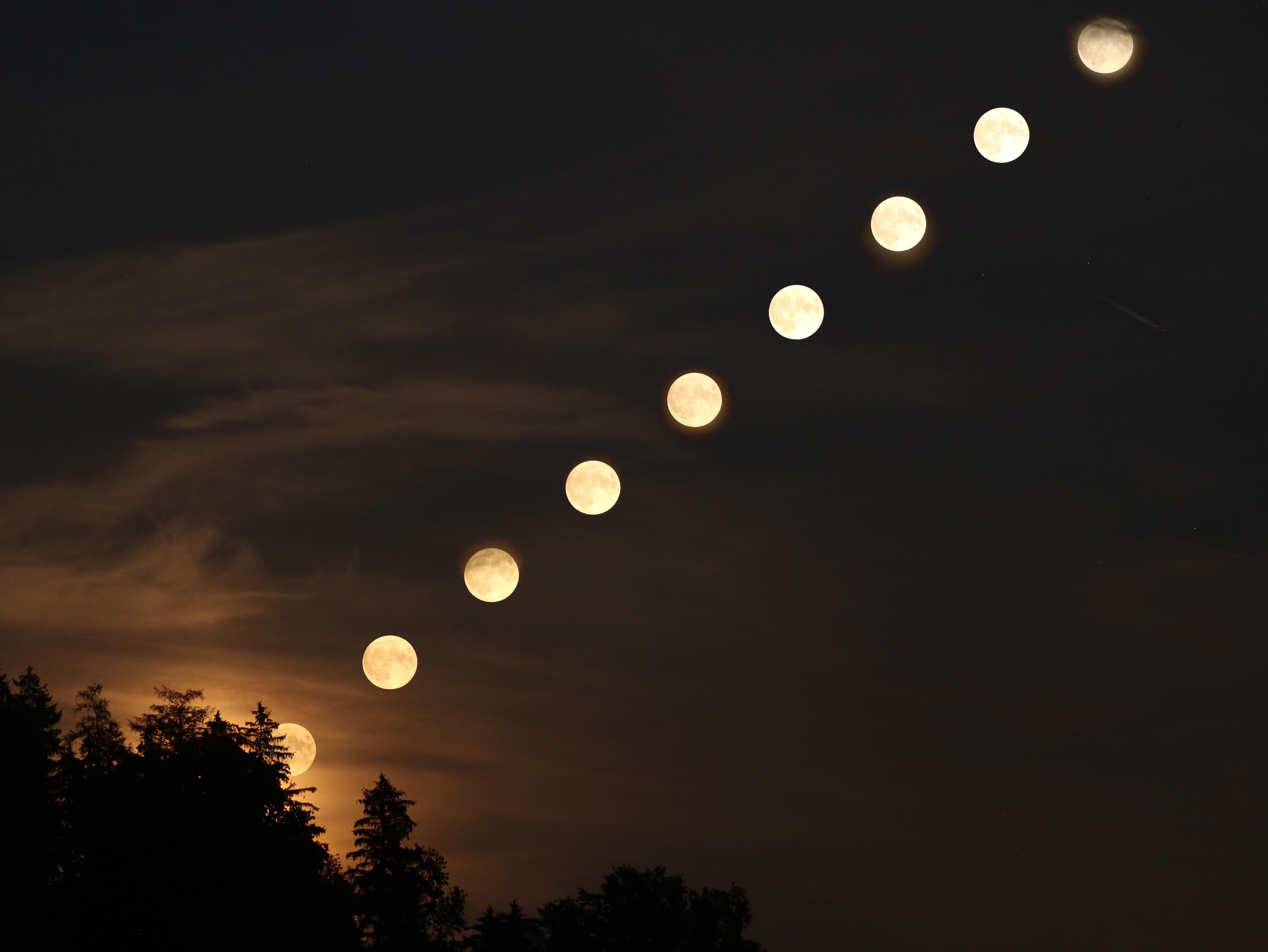 Hier hat es witterungsbedingt einige Monate gebraucht, um den Vollmond bei Aufgang zu erwischen. Gestern war es wieder soweit. Das Zusammenfügen erfolgte mittels MatLab - über die max() Funktion: Dabei wird bei zwei Bildern jeweils der Pixelwert übernommen, der die größte Helligkeit aufweist. Dieses Zusammenfügen erfolgt mehrmals mit allen Bildern der Serie. Das erste Bild (heller Mondschein hinter den Bäumen) ist dabei wesentlich länger belichtet worden (2s).