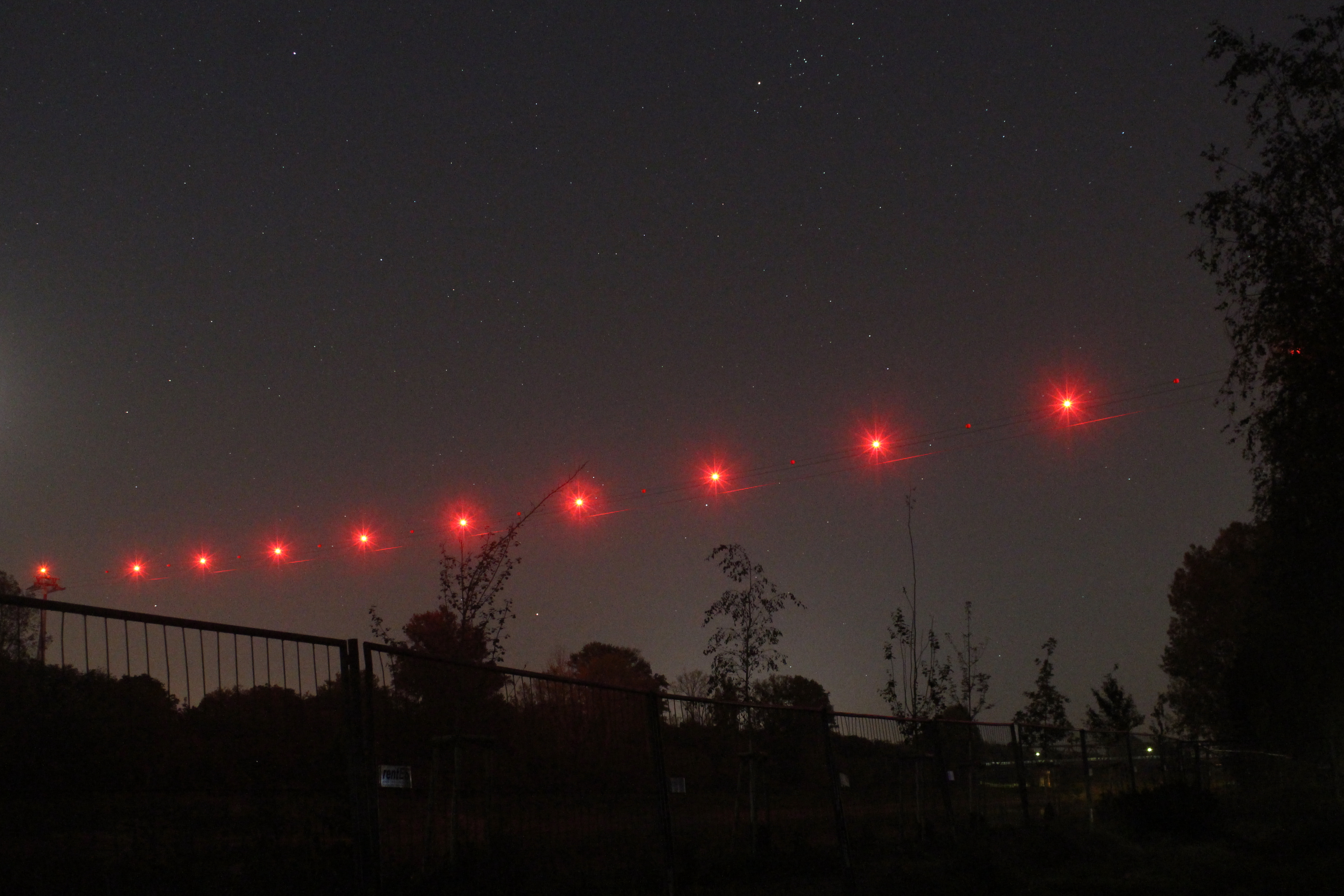 Das aufgehende Sternbild Orion mit der Lichterkette der Neckarquerung der Mannheimer Seilbahn.