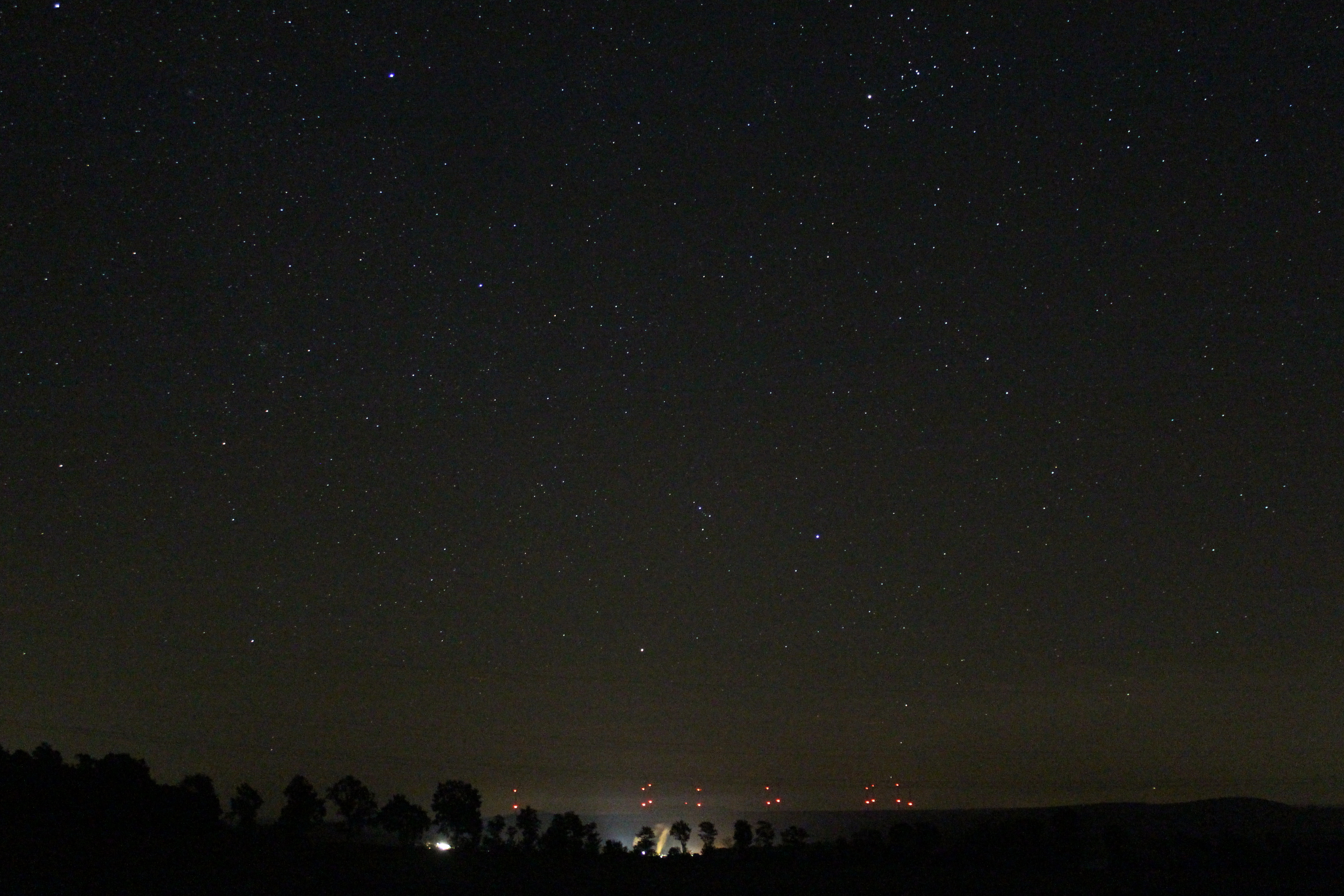 Aufgehendes Sternbild Orion mit den Windkraftanlagen des Windparks "Streu & Saale" im Vordergrund, aufgenommen nordöstlich von Wollbach in Unterfranken.