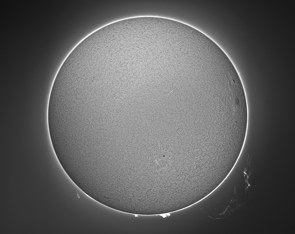Trotz tiefen Sonnenstands, schlechten Seeings und hoher, dünner Bewölkung riskierte ich am letzten Sonntagmorgen einen Blick auf die Sonne. Zu meiner Überraschung bot sich mir der Anblick einer sehr schönen aufsteigenden Protuberanz am Sonnenrand. Das Geschehen lief sehr rasch ab, eine Stunde später konnte ich durch mein kleines Sonnenteleskop nichts mehr von dieser dramatischen Erscheinung wahrnehmen.