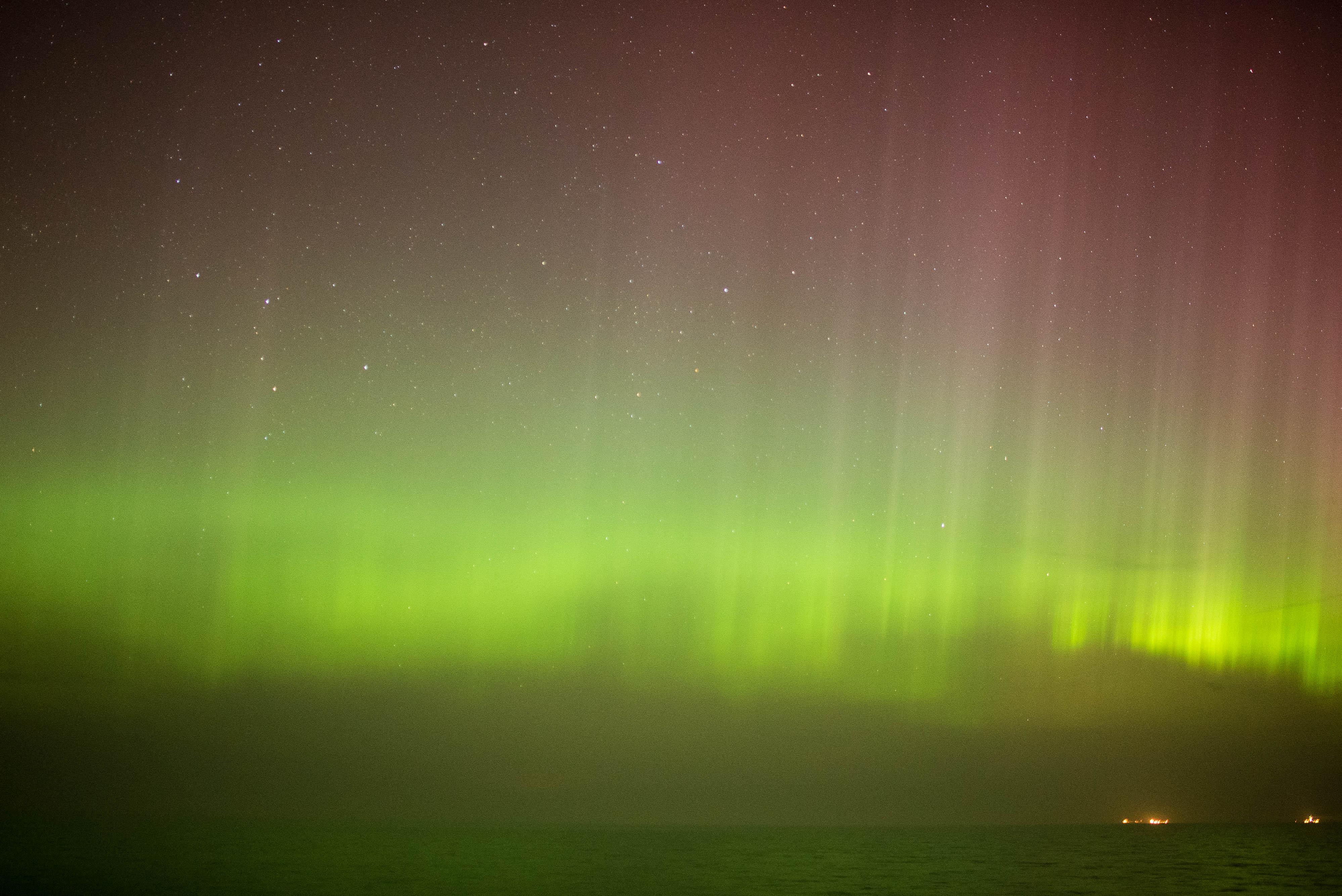 Nach einem koronalen Massenauswurf am 15.03. traf die Materie am 17.03. auf der Erde ein. Den ganzen Tag über war das interplanetare Magnetfeld südlich ausgerichtet und sorgte am Abend und in der Nacht für herrliche Nordlichter. Der kleine helle Punkt am unteren, rechten Bildrand ist der Leuchtturm Kiel...