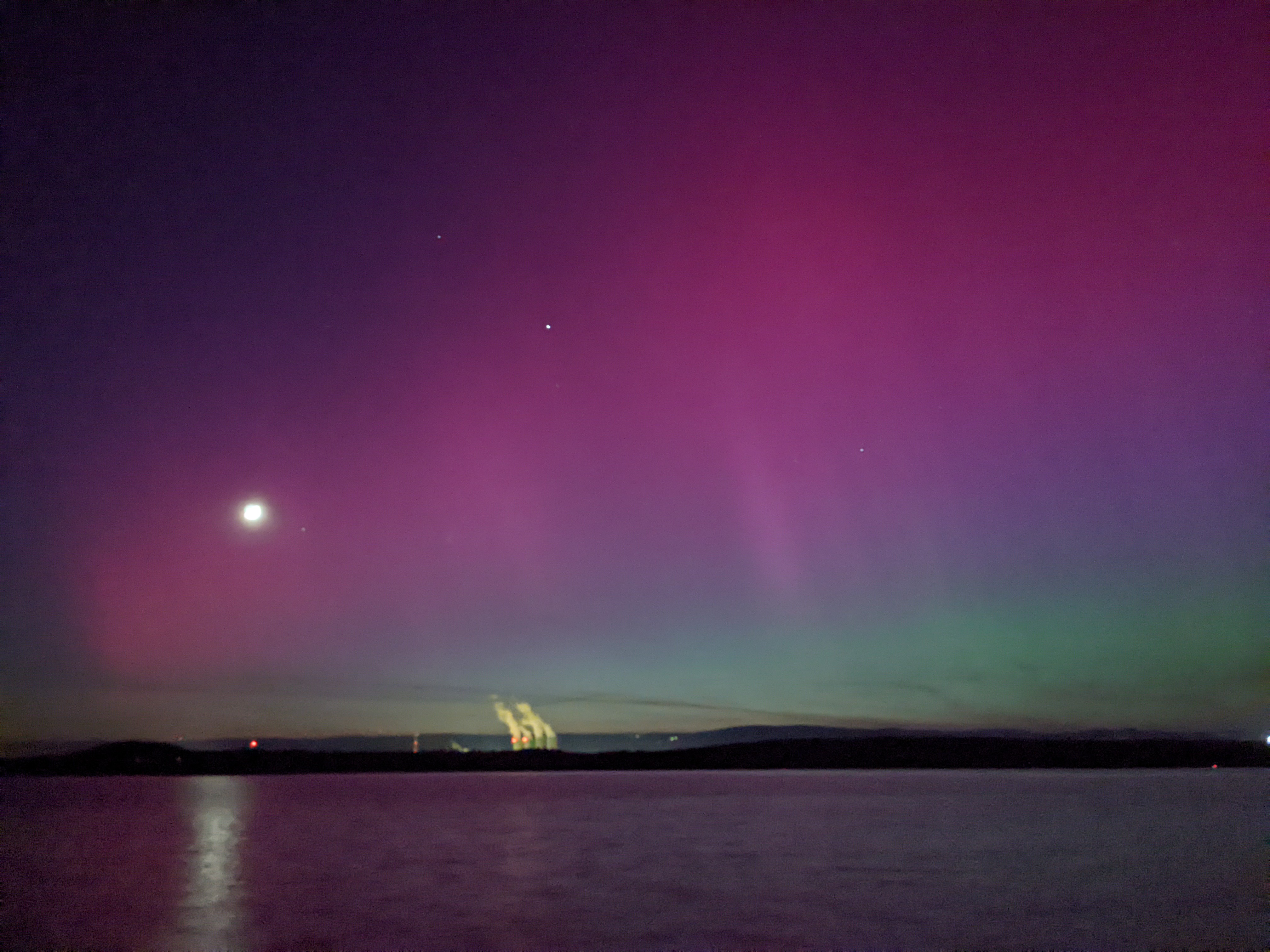 Aurora Borealis über See und Kohlekraftwerk bei Kadan, Tschechien