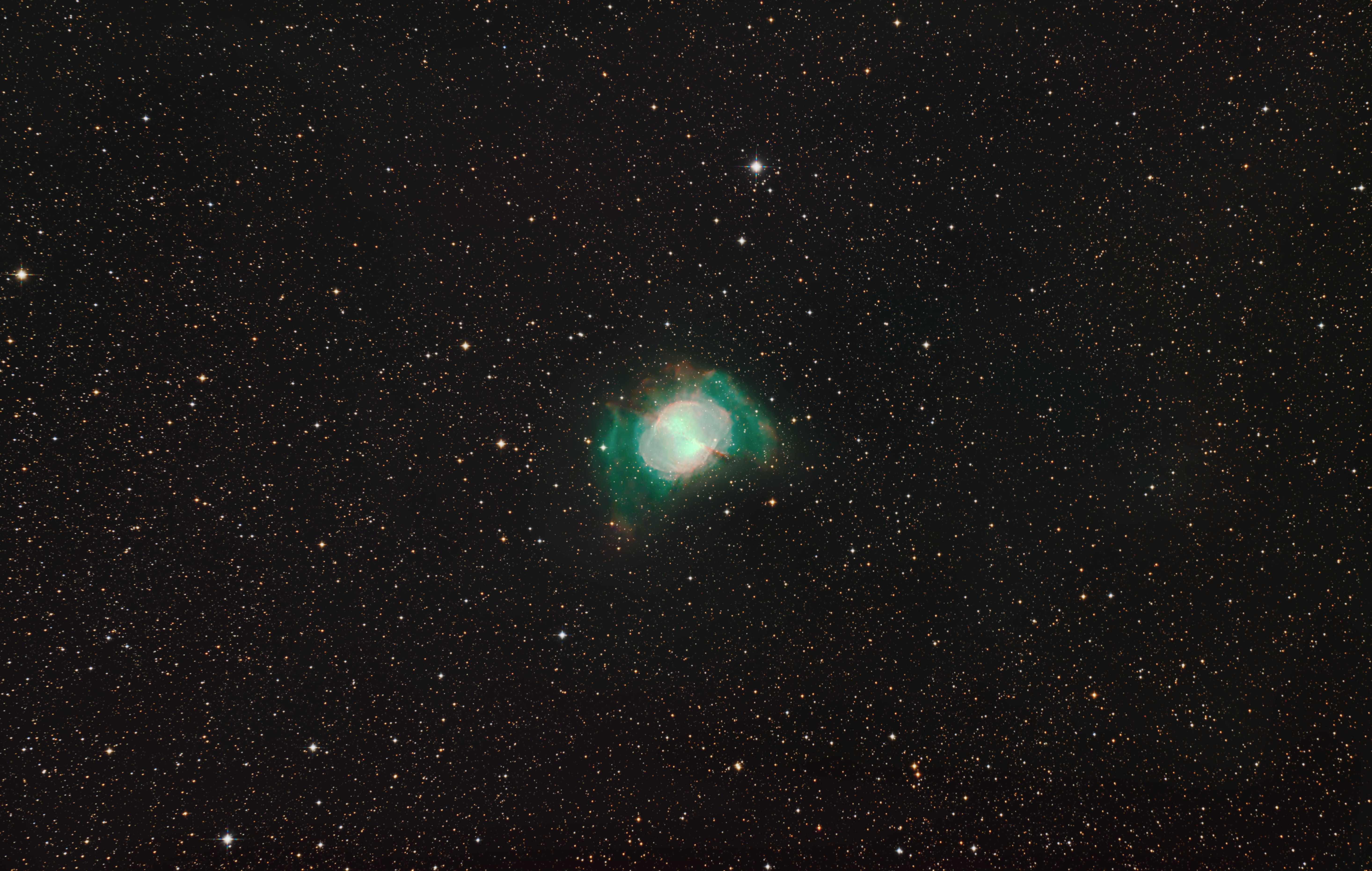 Also ich finde ja, auf wirklich lange belichteten Aufnahmen wird aus dem Hantelnebel M 27 eher der »Fledermausnebel«. Dieser Eindruck entsteht, wenn die besonders schwachen Ausläufer des planetarischen Nebels abgebildet werden können. Hierfür habe ich 8,5 Stunden lang mit dem Optolong L-eNhance (Tri-Band) belichtet und die Sterne später durch RGB-Sterne (10 Minuten Belichtungszeit ohne Einsatz eines Schmalbandfilters) mithilfe der Programme Siril und Gimp ersetzt.