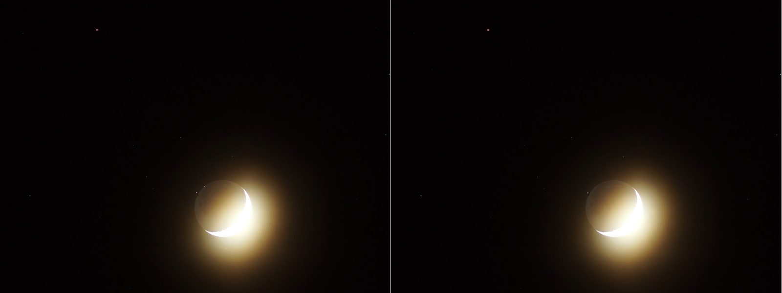 Am Abend des 10. April 2016 war es wieder mal soweit: Der Mond wanderte zur besten Zeit - und das noch als Sichel - durch die Hyaden. Voran mit der dunklen Seite der Sichel sollten einige helle Sterne bedeckt werden. Aldebaran fiel von Deutschland aus gesehen leider nicht darunter, ist jedoch links oben im Bild erkennbar. Aber das 3,4 + 3,8 mag helle Paar Theta-2 + Theta-1 Tauri wurden gegen 22:00 MESZ nacheinander schlagartig "ausgeknippst"! Die "dunkle" Seite des Mondes war durch das Sekundärlicht nicht völlig dunkel. Die Sichel wurde deshalb bewußt überbelichtet. Der scheinbare "Hof" stammt leider durch ein kurz vorher aufziehendes Zirrusband. Der Abstand der Aufnahmen beträgt 1/4 Sekunde, extrahiert aus einem "Echtzeitfilm".