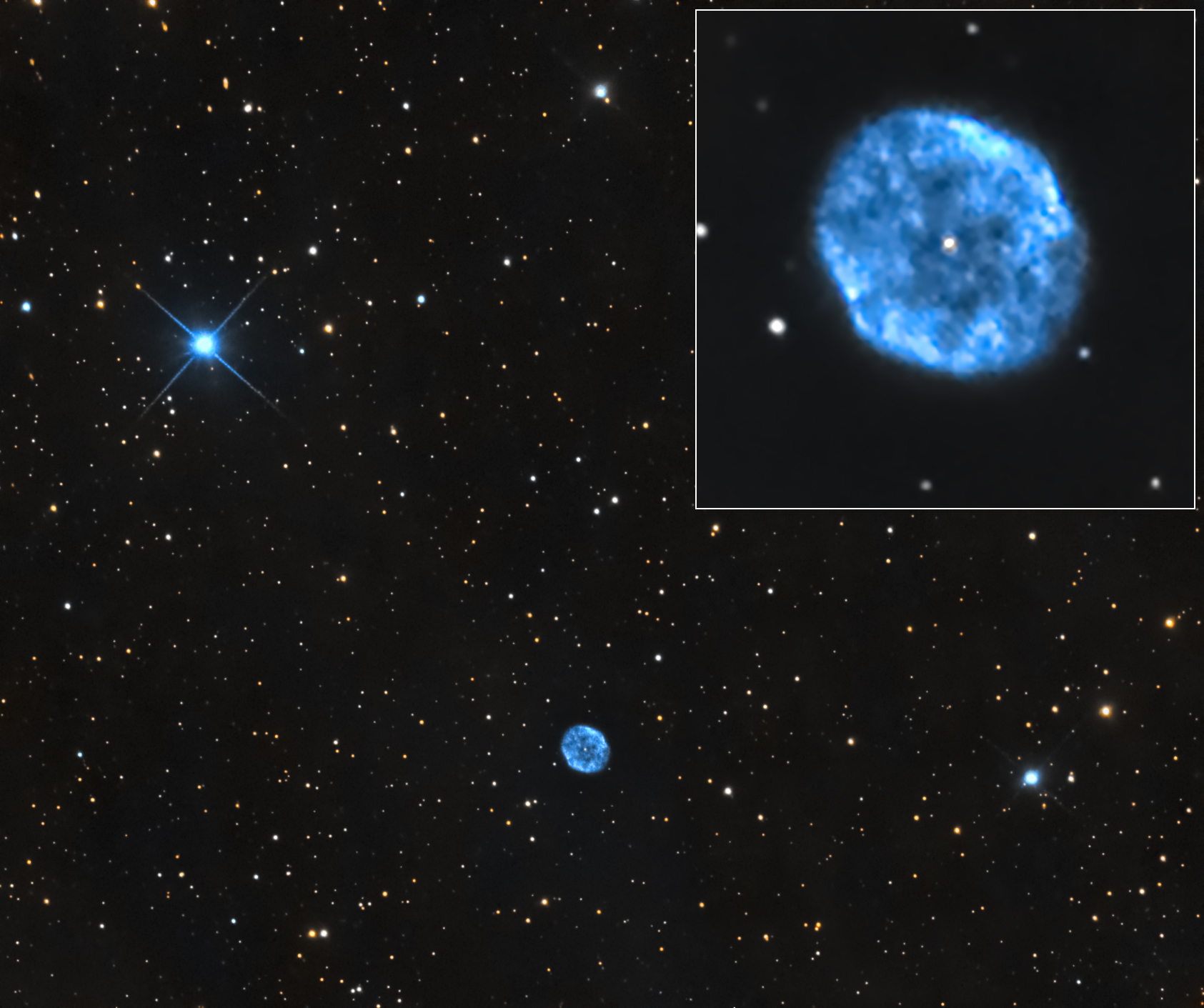 NGC 1501 (auch als Austernnebel bekannt) ist etwa 4000 Lichtjahre von uns entfernt, hat die Form eines Ellipsoids mit geringer Exzentrizität, aus dem vier Hauptkeulen hervorstehen, und in seinem Zentrum befindet sich ein Stern der WC4-Klasse, der dem eines Wolf-Rayet-Sterns ähnelt – Rayet ist reich an Kohlenstoff. Es handelt sich um einen pulsierenden Stern, was bedeutet, dass seine Helligkeit regelmäßig und periodisch variiert. In diesem Fall ist der Prozess unglaublich schnell, da sich die Helligkeit in nur einer halben Stunde erheblich ändert. Eine Analyse der Gaia-Daten legt nahe, dass es sich bei dem Zentralstern um ein Doppelsternsystem handelt, und Beobachtungen mit sichtbarem Licht zeigen die Emission von Gasen, darunter Wasserstoff und Stickstoff. Die Gesamtmasse des Nebels wird auf etwa 0,22 Sonnenmassen geschätzt, wovon der größte Teil ionisiertes Gas und ein kleiner Teil kohlenstoffreicher Staub ist.