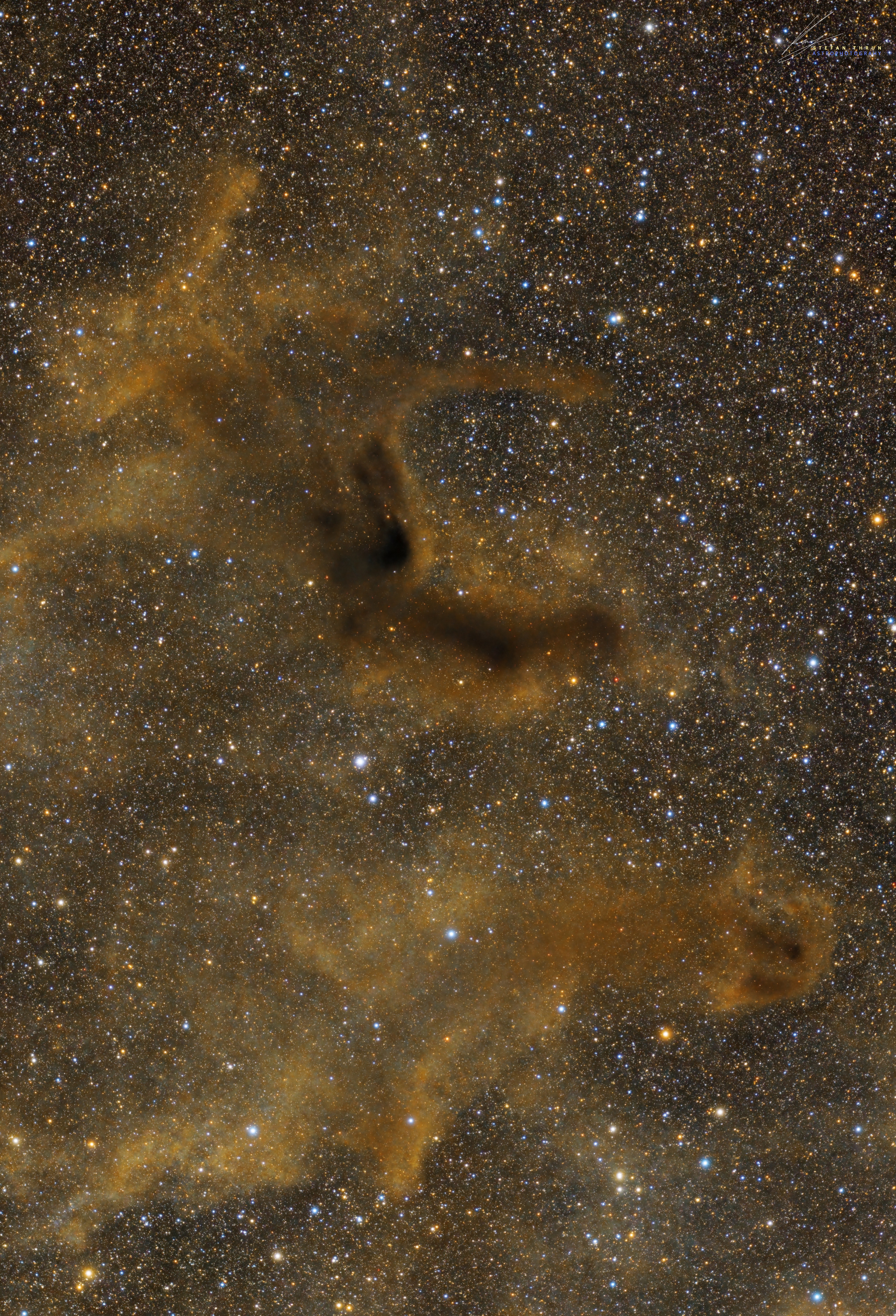 Hallo Sternfreunde, hier haben wir einen nicht oft fotografierten Dunkelnebel im Bereich unserer Milchstraße. Barnard 142/143, auch bekannt als Barnards E. Mein Ziel war es, diesen dunklen Nebel mit all seinen feinen Ausläufern sichtbar zu machen. Ich habe diese Gegend über fünf Nächte im Juli und August 2023 fotografiert. Ich hoffe, es ist mir gelungen und euch gefällt mein Bild. CS und bleib gesund,