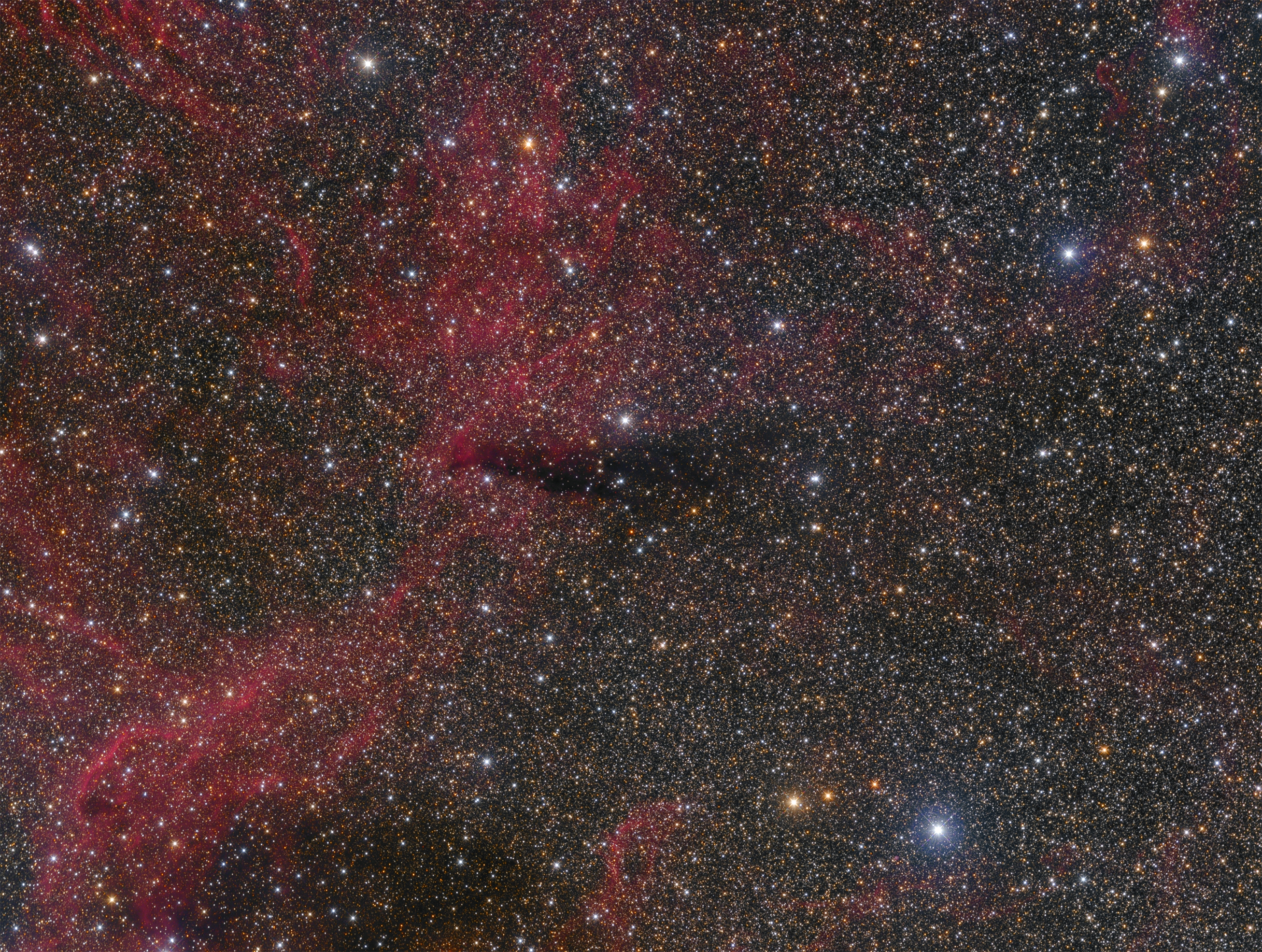 Barnard 145 ist ein etwa 40 Bogenminuten großer, langgestreckter Dunkelnebel. Seine Form erinnert mich an einen nach links laufenden Vogel mit scharfem Schnabel … B 145 wird etwa zur Hälfte von einem Emissionsnebel überlagert - LBN 190. Dieser wiederum ist Teil des viel größeren Sharpless 109. Links unten liegt LBN 189. Wer genau schaut, findet vielleicht den kleinen Planetarischen Nebel NeVe 2 (Neckel-Vehrenberg) in rechten unteren Bereich nächst dem hellen blauen Stern. Um den Emissionsnebel besser betonen zu können, wurden zusätzliche H-Alpha-Aufnahmen gemacht und dem L-RGB überlagert. Insgesamt wurde in neun Nächten belichtet.