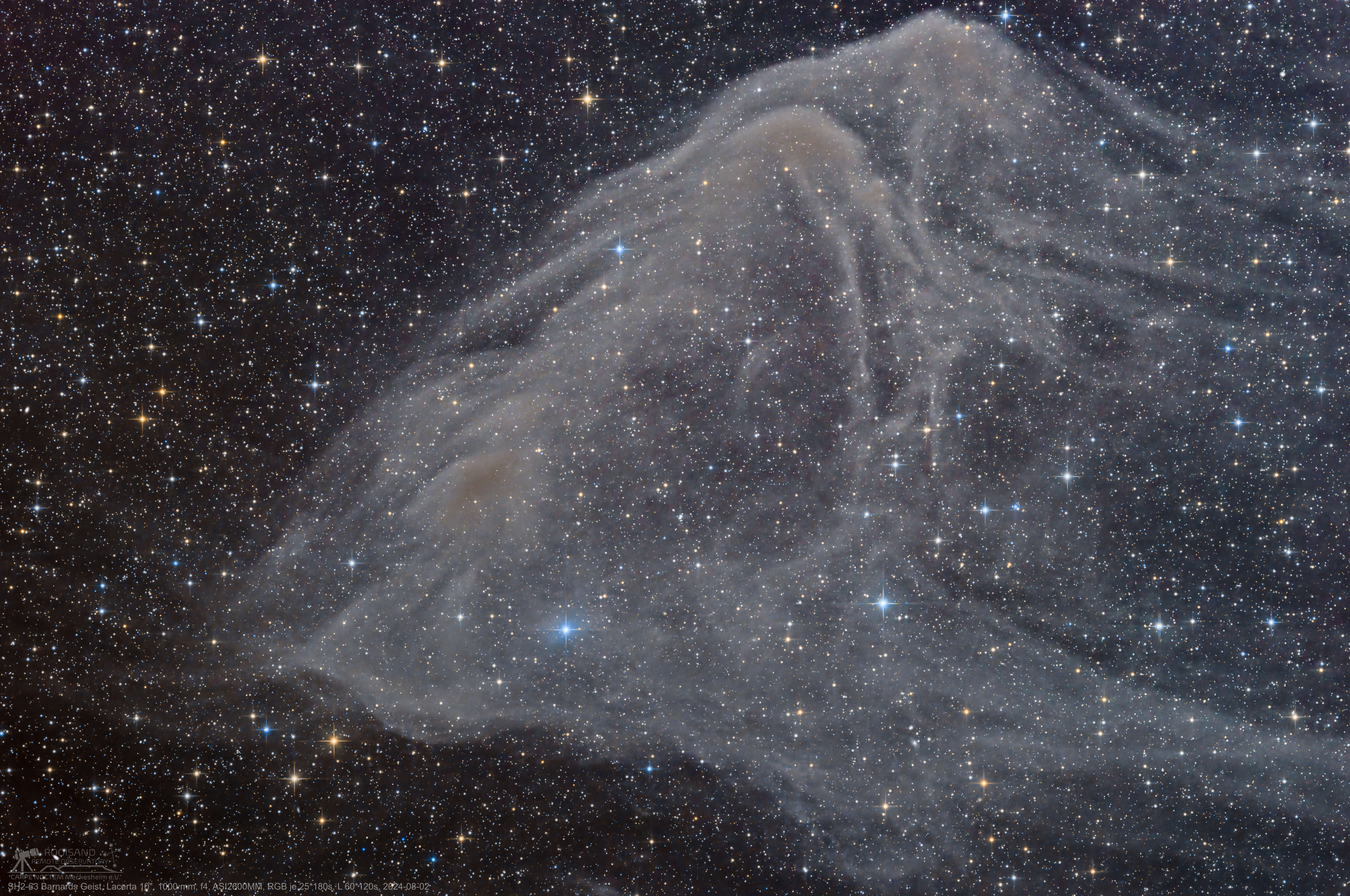 Im Sternbild Schütze liegt dieses einem Geist ähnliche, sehr lichtschwache Objekt. Auffällig sind die Strähnen von schwach reflektierenden Wolken, dem galaktischer Zirrus. Ursprünglich als HII Region beschrieben, ist er aber ein Reflexionsnebel, der von unserer Milchstraße angestrahlt wird und so mit seinen weißlichen und bräunlichen Farben die Eigenschaften eines Reflexionsnebels zeigt. Vermutlich wird er Barnard’s Geist genannt, weil er nahe der gleichnamigen Galaxie liegt. Er ist für uns scheinbar doppelt so groß wie unser Mond. Ich habe das Bild als Mitglied der Carpe Noctem Remote Gruppe der Volkssternwarte Meckesheim e.V. aufgenommen.