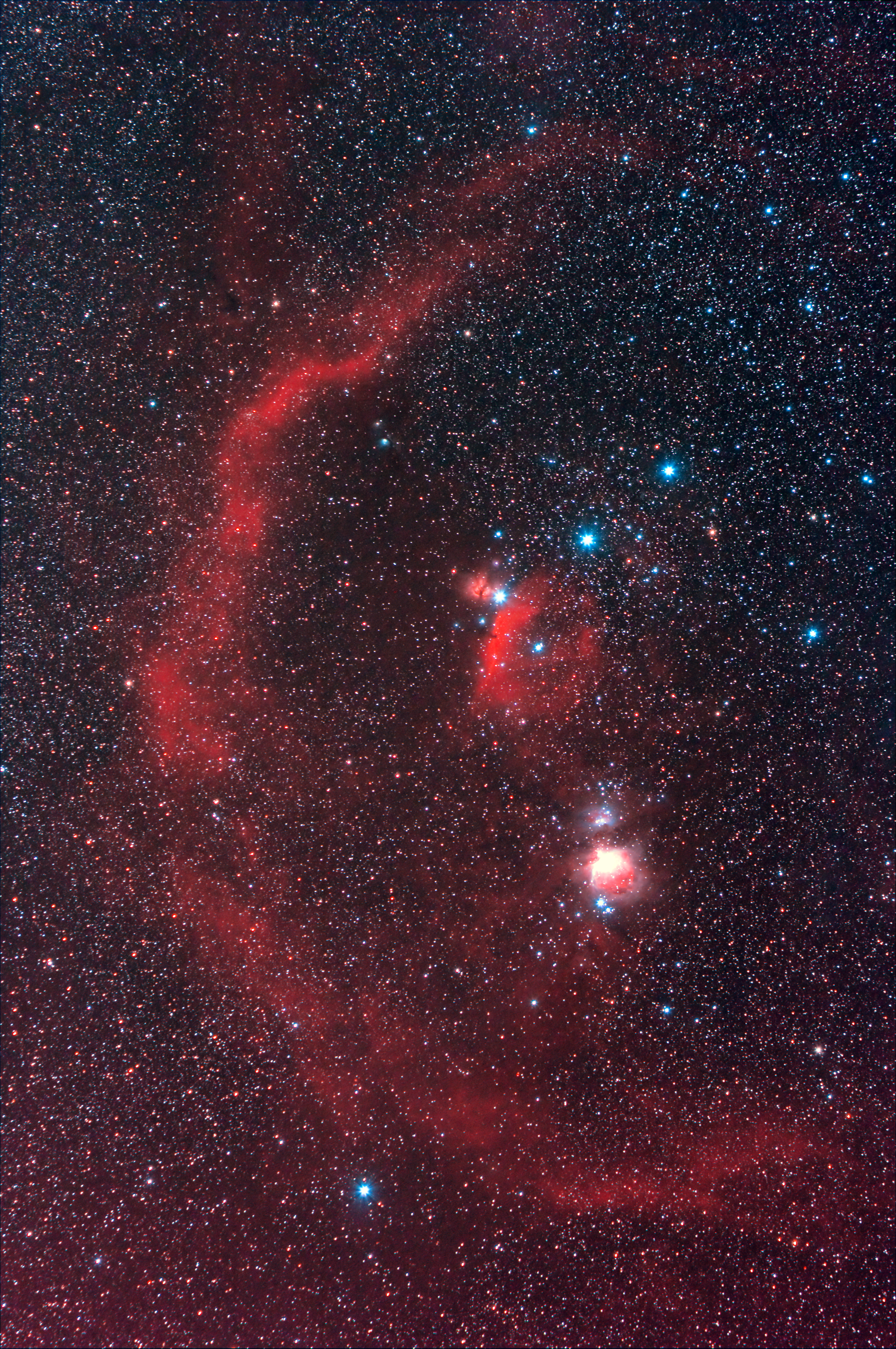Von allen großflächigen Emissionsnebeln, die bereits mit kleiner Brennweite formatfüllend aufgenommen werden können, ist Barnards Loop der hellste. Dennoch bedarf es eines guten Himmels, um ihn kontrastreich darzustellen.