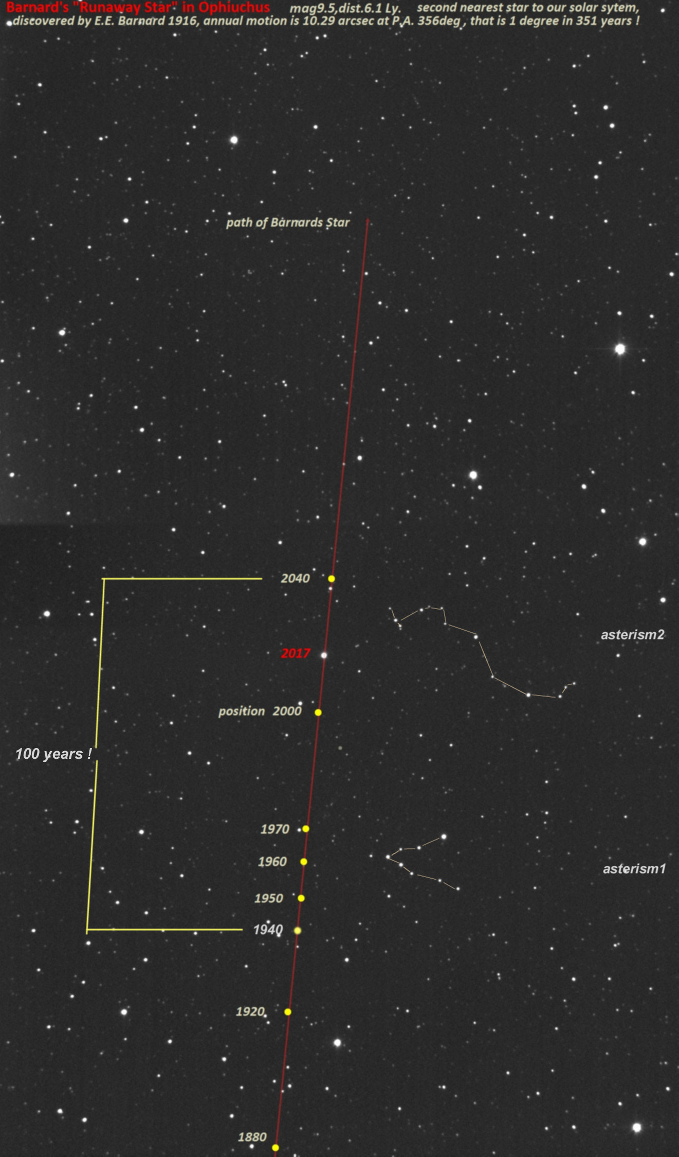 Fortsetzung zur vorigen Aufnahme, Bahn von Barnards Pfeilstern in diesem Jahrhundert mit Positionen, Mosaik aus zwei Bildern um den Pfeilstern.
