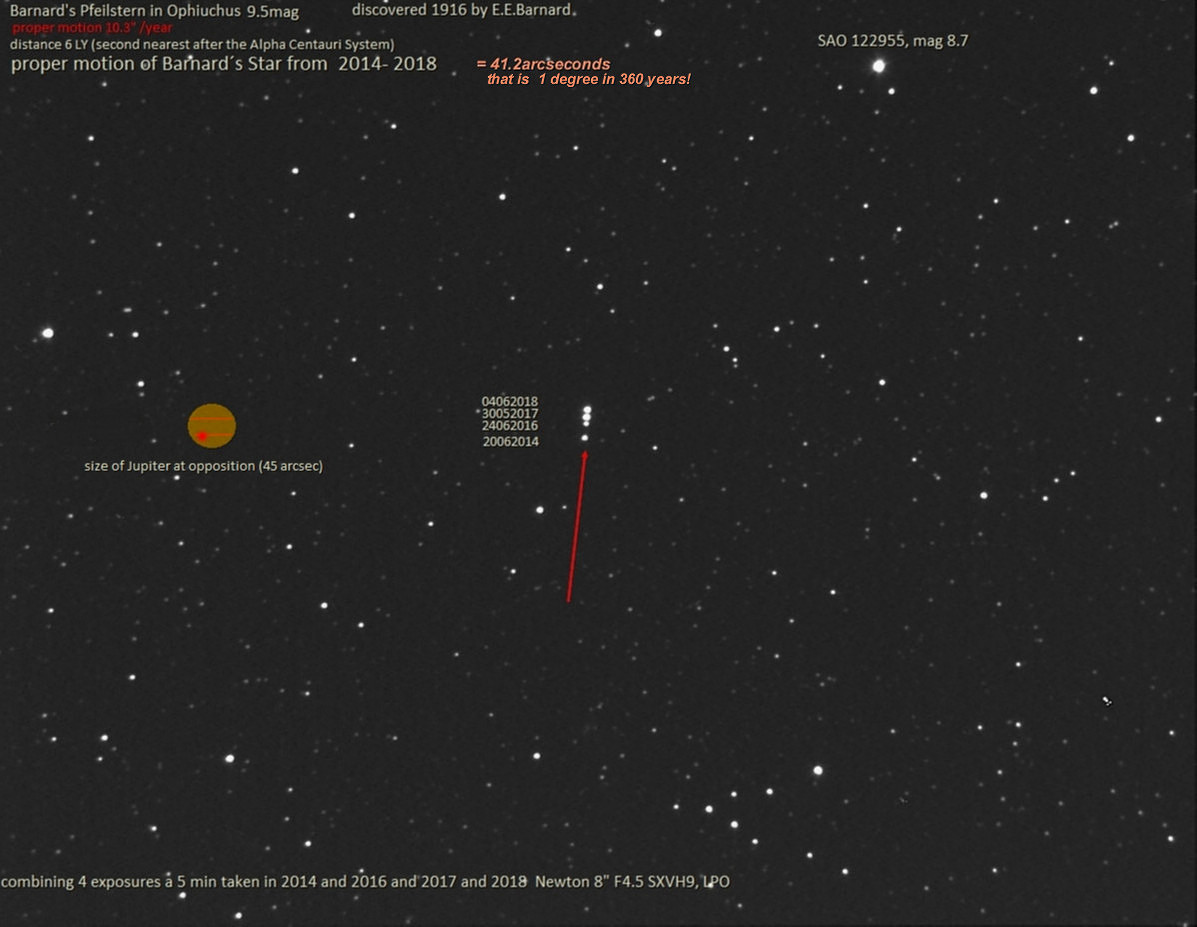 Seit vier Jahren verfolge ich Barnards Star im Schlangenträger auf seiner Bahn nach Norden. In 360 Jahren legt er ein Grad zurück.(10,3 Bogensekunden pro Jahr, 9,5 mag). Im Jahr 11800 wird er der Sonne mit 3,8 Lichtjahren am nächsten sein, mit 25 Bogensekunden im Jahr vorbeifliegen, und mit 8,5 mag leuchten!