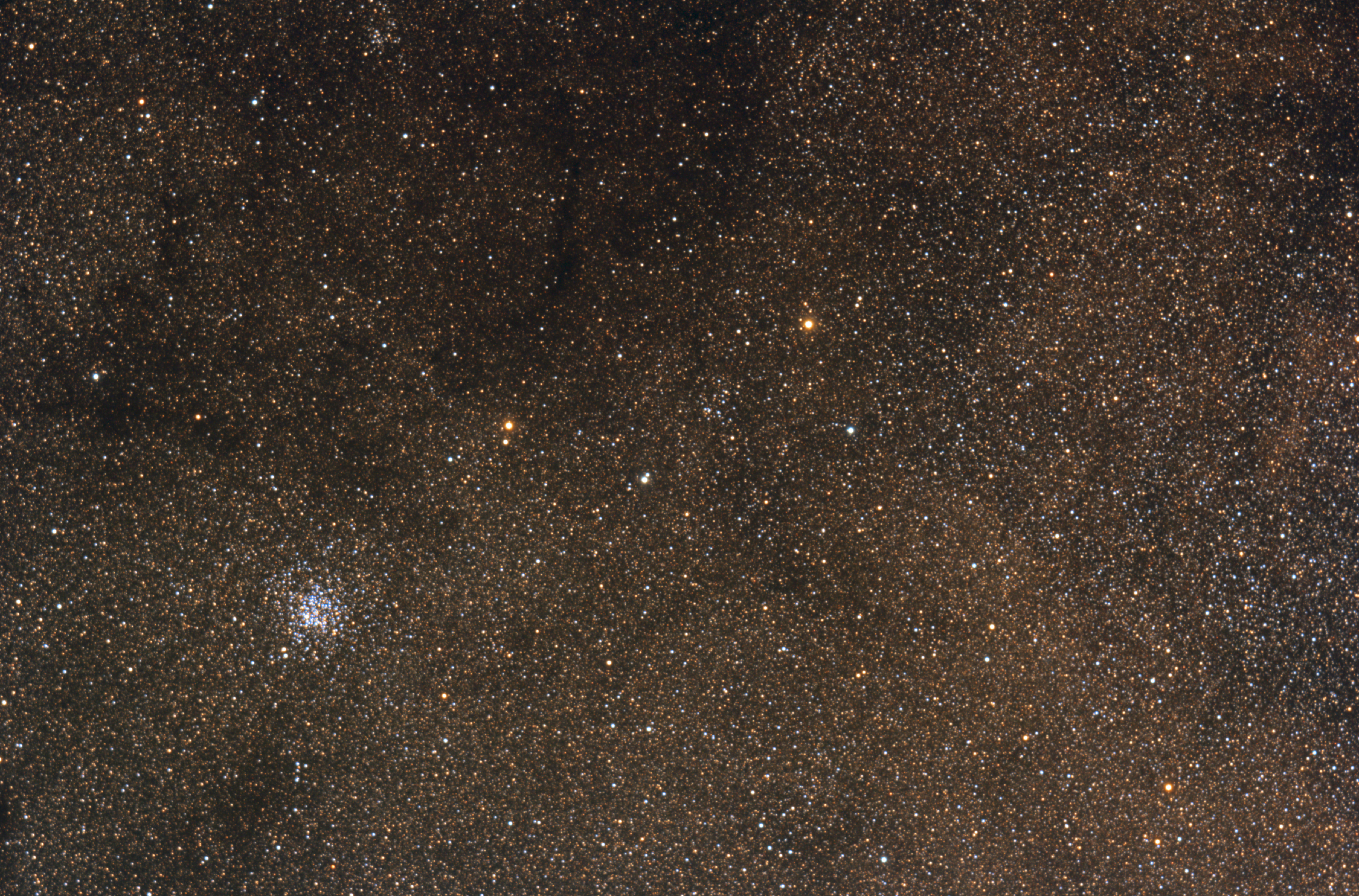 Messier 11 links unten enthält rund 2900 Sterne. Das sehr reiche Sternfeld beinhaltet Barnard 111 und 119 als Dunkelnebel über M 11. Barnard 112 befindet sich direkt unter M11. B108 ist rechts vom M11. Basel 1 befindet sich der Mitte des Bildes zwischen den zwei gelben und zwei bläulich weißen Sternen. In diesem Sternfeld befinden sich auch noch etwa acht Planetarische Nebel. Messier 11 ist 6000 Lichtjahre von uns entfernt.