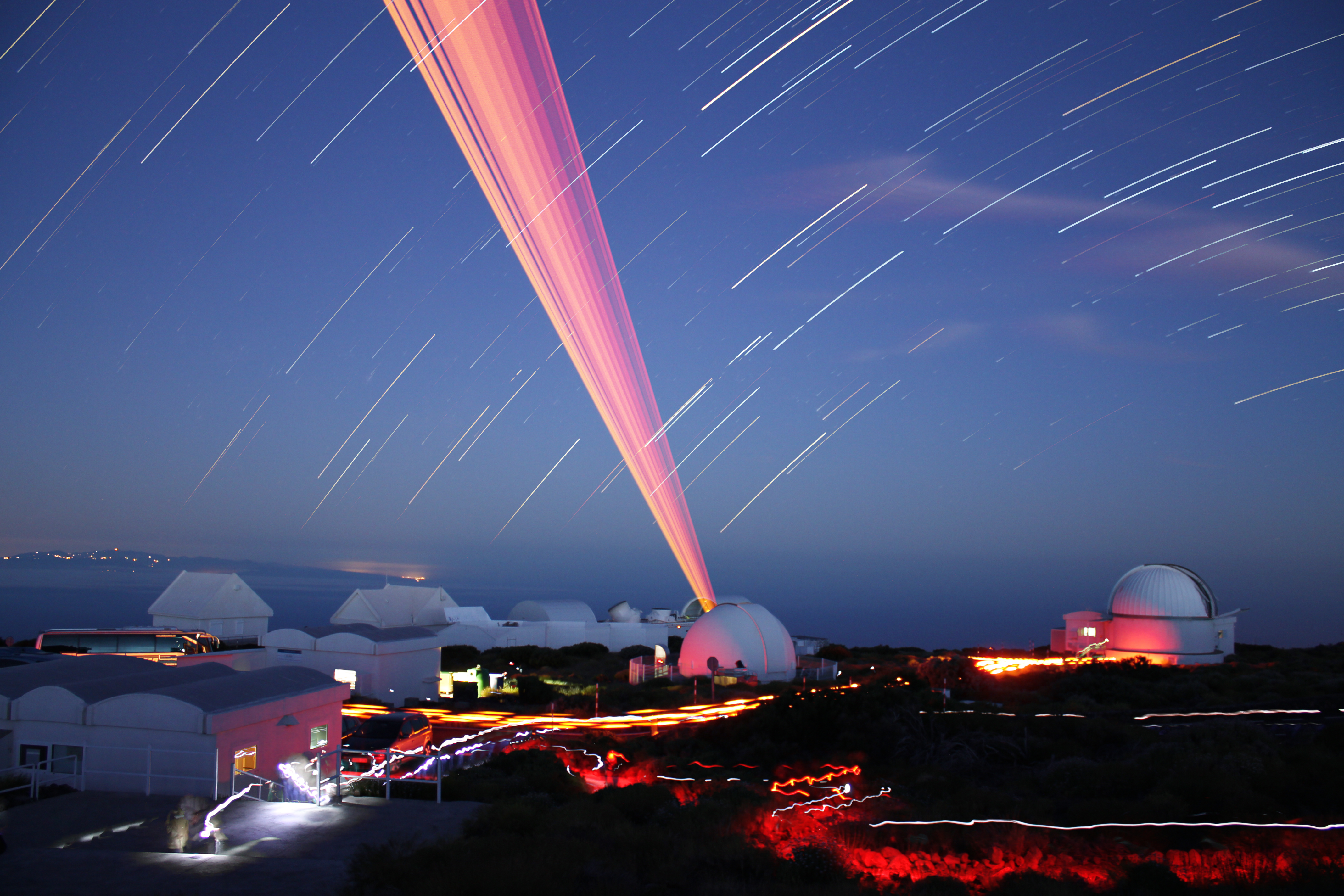 Die Strichspur-Aufnahme entstand am Ende der blauen Stunde während eines Astronomie und Astrofotografie Workshops am 19. Juni 2015 am Observatorio del Teide auf Teneriffa. Das Bild zeigt einen Teil des Observatoriums mit Blick Richtung SSO. Rechts im Bild befindet sich die Kuppel des Infrarot-Teleskops TCS, in der Mitte eine Kuppel mit Laseranlage, an dem gerade Tests für die Entwicklung der adaptive Optik des E-ELT der ESO durchgeführt wurden. Der Laser wurde nachgeführt und in der Frequenz durchgestimmt, daher entstand der schöne Farbfächer in der kombinierten Aufnahme. Unmittelbar links hinter dem Laser befinden sich die neuen Teleskope des QUIJOTE Experiments zur Messung der Polarisation der kosmischen Hintergrundstrahlung. Die Einweihung erfolgte am 27.6. durch den Spanischen König, etwa eine Woche nach dieser Aufnahme. Am linken Bildrand sieht man die Lichter von Gran Canaria sowie die Silhouette der Insel selbst. In der Strichspur-Aufnahme erkennt man in der Mitte das Sternbild Skorpion mit Antares als hellster Spur am oberen Bildrand. Im Vordergrund ist noch reges Treiben am Observatorium zu erkennen, das an diesem Tag von einer Gruppe von Schülern und Teilnehmern unseres Workshops besucht wurde.