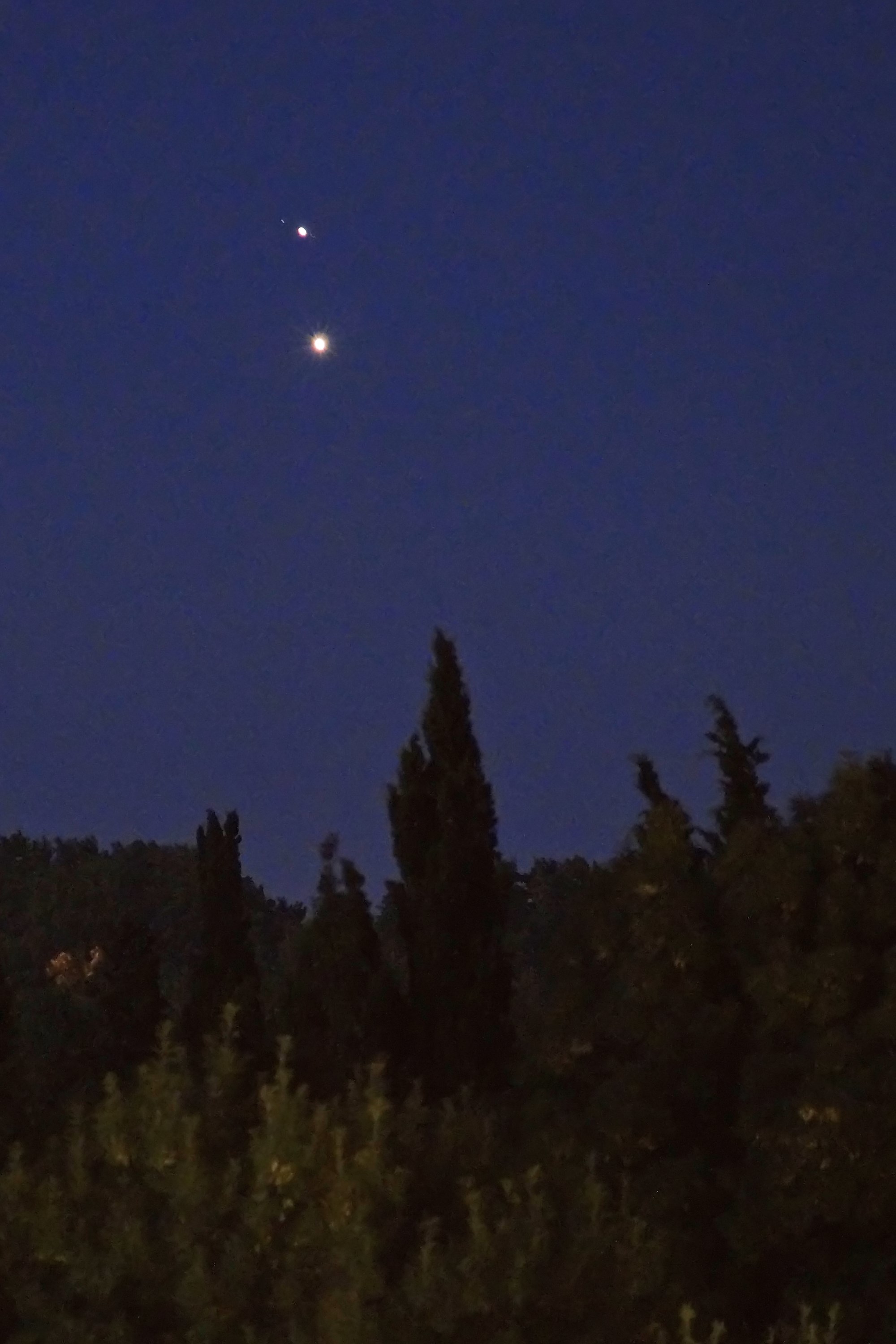 Dieses Bild ist am 30. Juni 2015 kurz vor dem Untergang von Venus und Jupiter gegen Mitternacht entstanden. Dank des klaren Himmels über der Provence konnte man das Schauspiel beobachten, bis die beiden Planeten hinter den Bäumen am Horizont verschwanden.