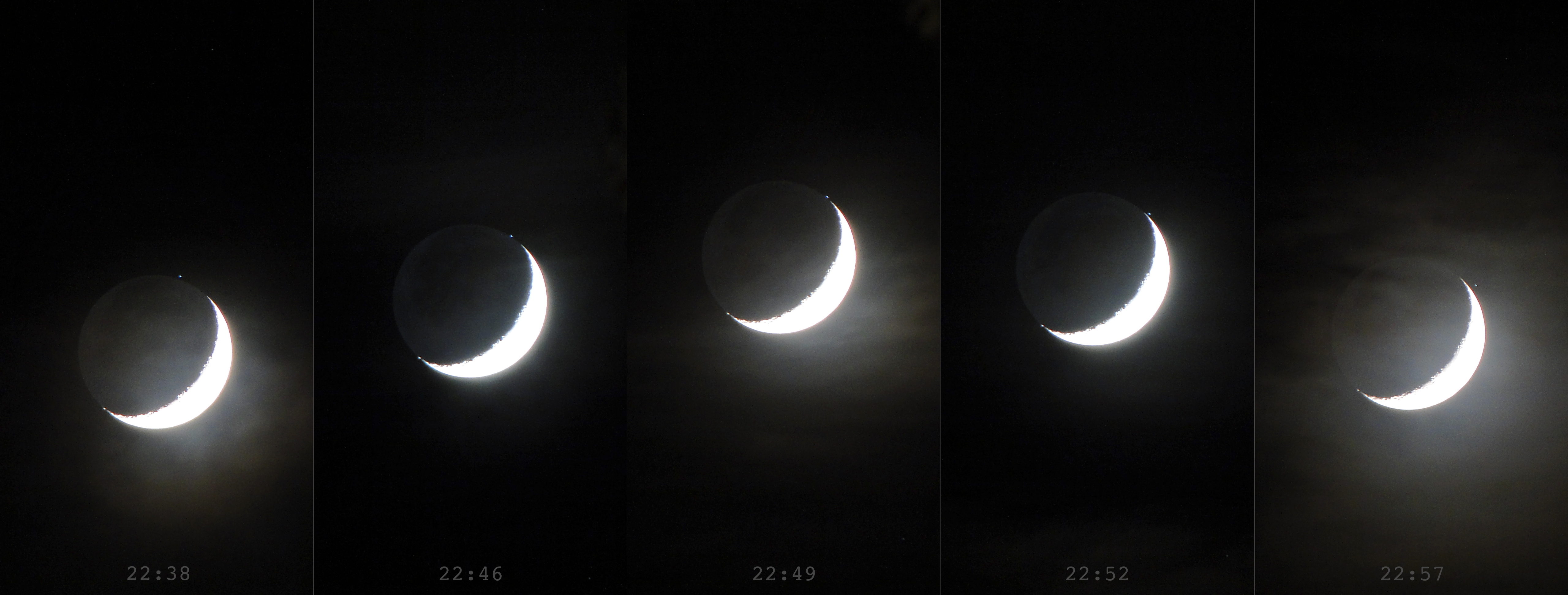 Die Sequenz zeigt den Verlauf der nahen Begegnung von Zeta Tauri und dem Mond, festgehalten mit der Digitalkamera zwischen 22:38 und 22:57 Uhr MESZ in der Nähe von München. Einige Kilometer weiter südlich wäre aus der Begegnung eine Bedeckung geworden.