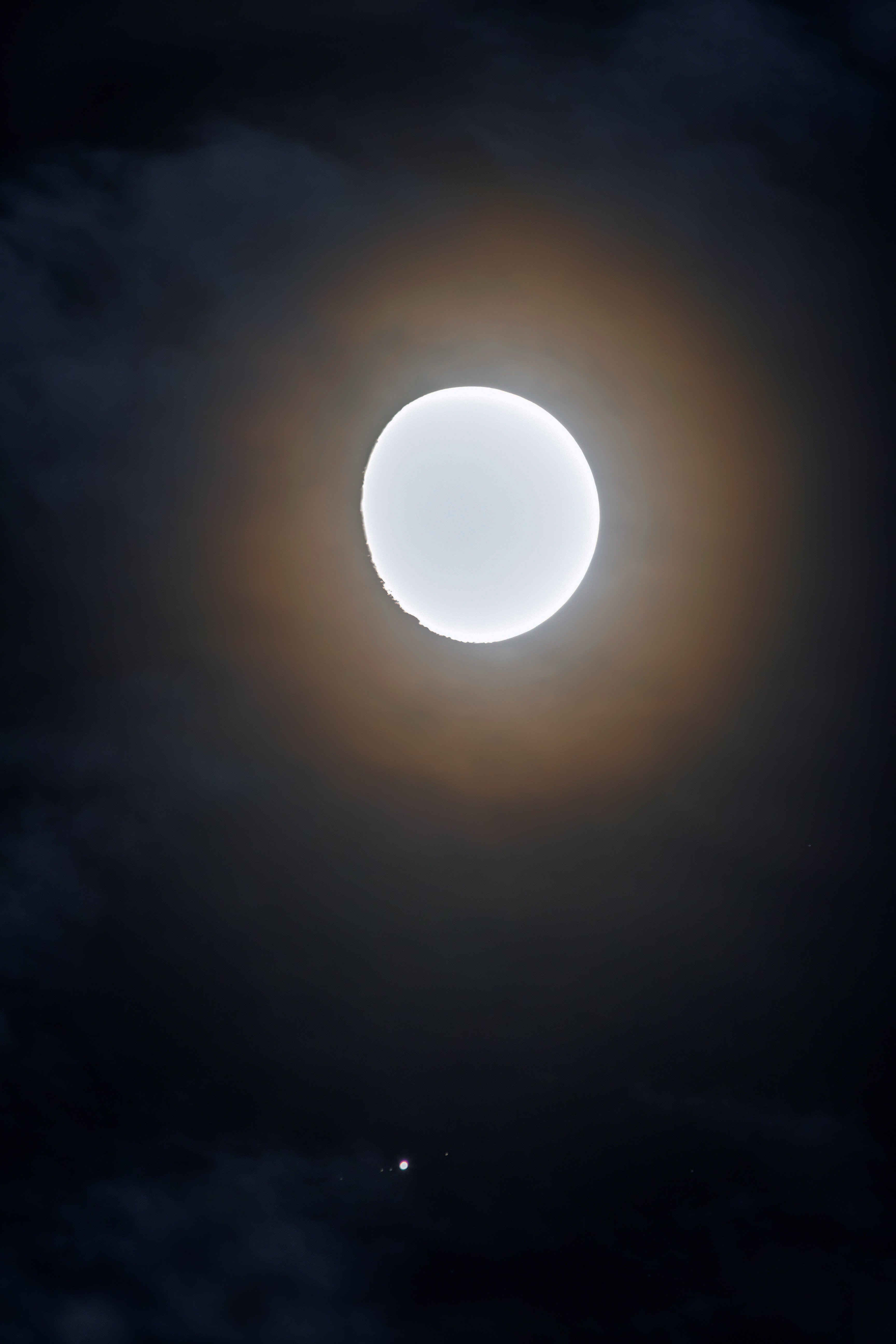 Durch die dichten Wolken hatte der Mond eine feine Farbhalo. Monddetails sind bei 1/2 Sekunde zwar nicht mehr zu sehen, aber dafür Jupiters vier galileische Monde.
