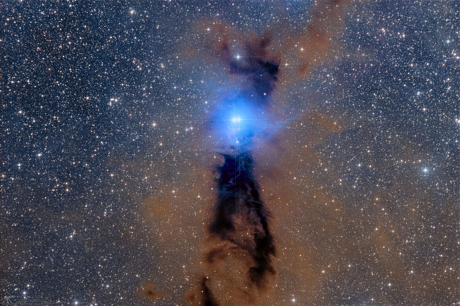 Bernes 149, auch bekannt als Sharpless-2 014 oder GN 16.05.2, zeigt einen Reflexionsnebel vor dunklem Staub im Sternbild Wolf. Das Bild wurde von Andy Bender am abgelegenen Observatorium in Namibia bei Rooisand aufgenommen